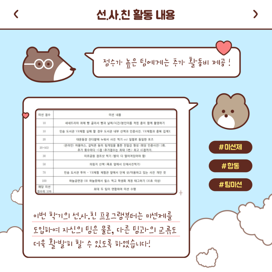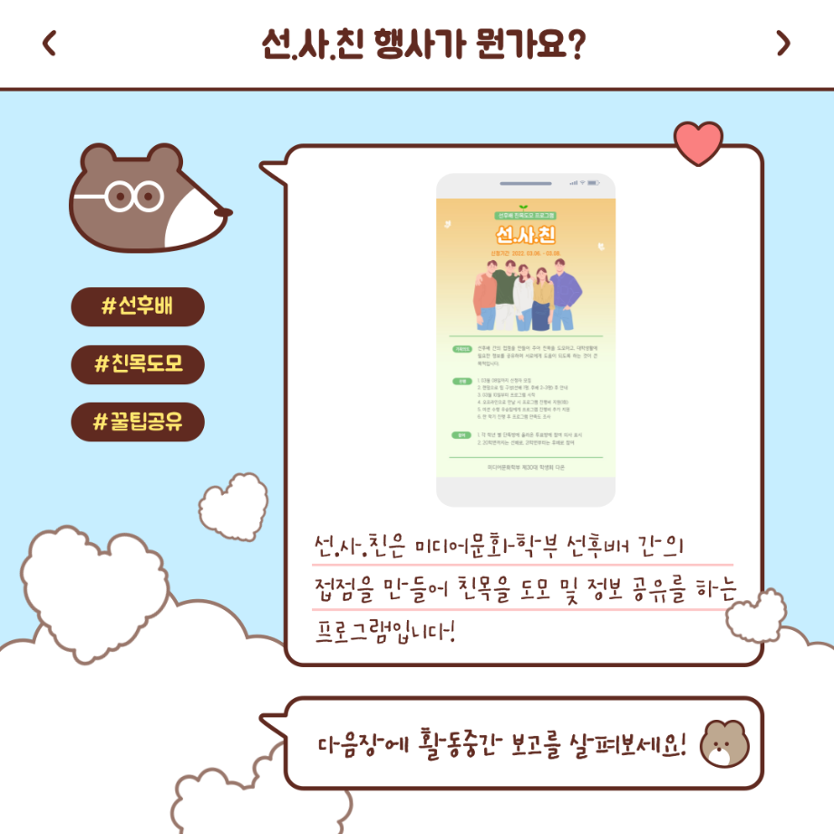 본문 시작 홈으로 커뮤니티 학부소개 교육과정 학부소식 커뮤니티 홈페이지가이드 학생회 학생회 동아리 자료실 장비대여 자유게시판 학생회 페이스북 트위터 프린트 [학생회 활동] 2022년 1학기 선.사.친 활동 중간보고 학생회 3260 2022-04-30 이번 학기 선.사.친 활동부터는 미션제를 도입하여 더욱 활발하게 활동할 수 있도록 하였습니다! 자세한 활동 사진은 학부 인스타그램에서 확인 부탁드립니다 :) 목록 이전[학생회 활동] 미문상담소 다음 [학생회 활동] 지구방위대 챌린지 촬영 보고 담당부서 : 미디어문화학부 담당자 : - 연락처 : 043-649-1760 최종수정일 : 2024-10-26 만족도조사 만족도 조사 이 페이지에서 제공하는 정보에 대하여 만족하시나요? 매우만족 만족 보통 불만족 매우불만족