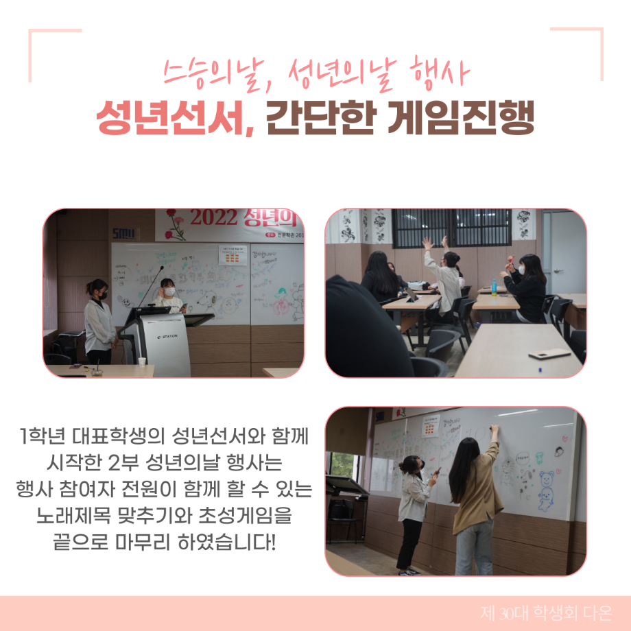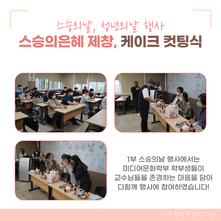 본문 시작 홈으로 커뮤니티 학부소개 교육과정 학부소식 커뮤니티 홈페이지가이드 학생회 학생회 동아리 자료실 장비대여 자유게시판 학생회 페이스북 트위터 프린트 [학생회 활동] 스승의날, 성년의날 행사 되돌아보기 학생회 3292 2022-05-20 지난 5월13일에 미디어문화학부 스승의날과 성년의날 행사가 있었습니다! 행사 진행과정을 한번 살펴볼까요? 1부 스승의날 행사에서는 미디어문화학부 학부생들이 교수님들을 존경하는 마음을 담아 다함께 행사에 참여하였습니다! 1학년 대표학생의 성년선서와 함께 시작한 2부 성년의날 행사는 행사 참여자 전원이 함께 할 수 있는노래제목 맞추기와 초성게임을 끝으로 마무리 하였습니다! 목록 이전미디어문화학부 전공 체험 - 제천제일고 다음 🏆미디어문화학부 학생회, 2022 E-sports 대회 : 인문예술리그 개최🏆 담당부서 : 미디어문화학부 담당자 : - 연락처 : 043-649-1760 최종수정일 : 2024-10-26 만족도조사 만족도 조사 이 페이지에서 제공하는 정보에 대하여 만족하시나요? 매우만족 만족 보통 불만족 매우불만족