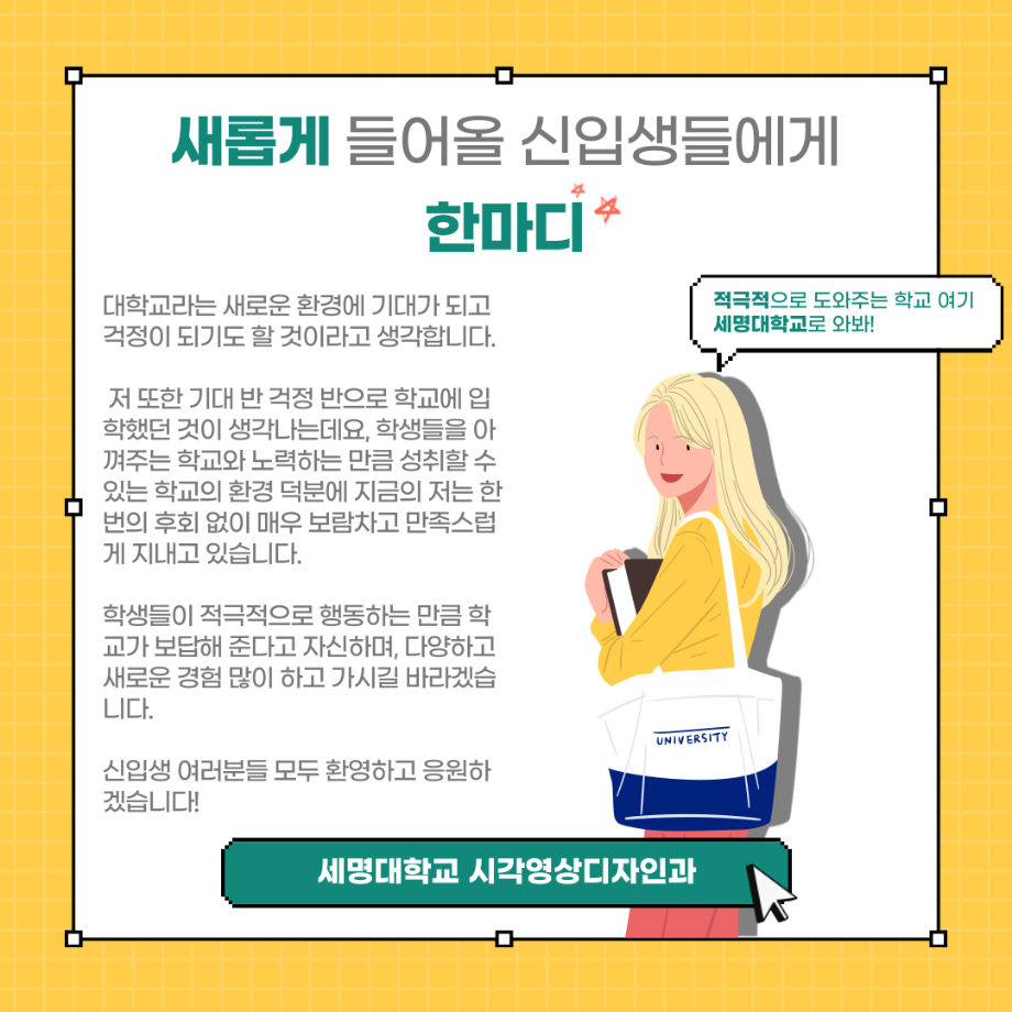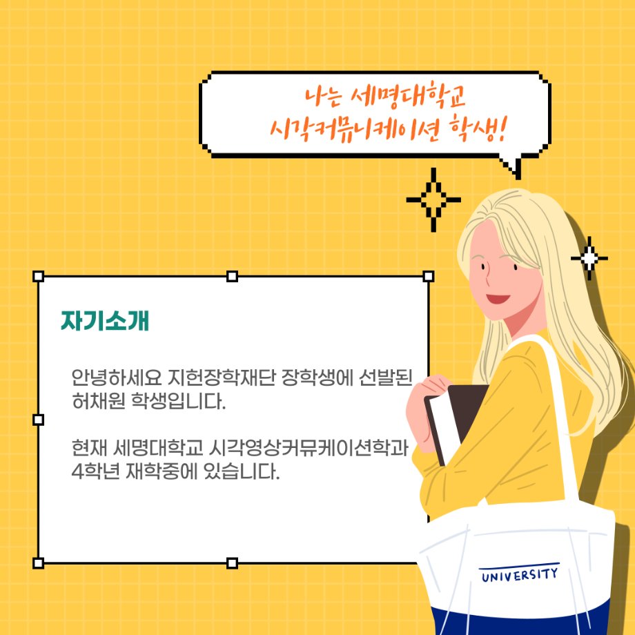 본문 시작 홈으로 학과자랑 학과소개 학과과정 시영소식 입학/취업 AI 학과자랑 SNS소통 홈페이지가이드 갤러리 학과자랑 갤러리 공모전 동아리 졸업전시회 갤러리 페이스북 트위터 프린트 지헌장학재단 장학생 소개 (1) 시각영상디자인학과 4345 2022-04-28 목록 이전귀여운 세명대 마스코트 이모티콘! 다음 지헌장학재단 장학생 소개(2) 담당부서 : 시각영상디자인학과 담당자 : - 연락처 : 043-649-1726 최종수정일 : 2024-10-26 만족도조사 만족도 조사 이 페이지에서 제공하는 정보에 대하여 만족하시나요? 매우만족 만족 보통 불만족 매우불만족