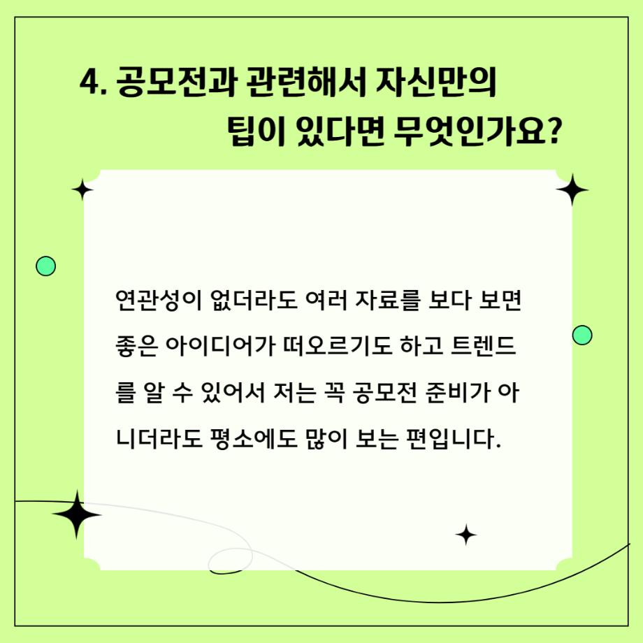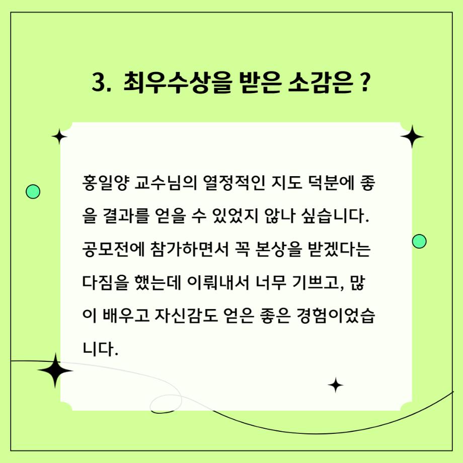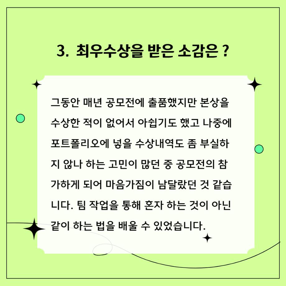 본문 시작 홈으로 학과자랑 학과소개 학과과정 시영소식 입학/취업 AI 학과자랑 SNS소통 홈페이지가이드 갤러리 학과자랑 갤러리 공모전 동아리 졸업전시회 갤러리 페이스북 트위터 프린트 공모전 최우수상 입상자 인터뷰 - 김한별 학생 시각영상디자인학과 3195 2023-06-12 목록 이전공모전 대상 입상자 인터뷰! - 이성복 학생 다음 벽화활동 인터뷰 - 박범준 학생 담당부서 : 시각영상디자인학과 담당자 : - 연락처 : 043-649-1726 최종수정일 : 2024-10-26 만족도조사 만족도 조사 이 페이지에서 제공하는 정보에 대하여 만족하시나요? 매우만족 만족 보통 불만족 매우불만족