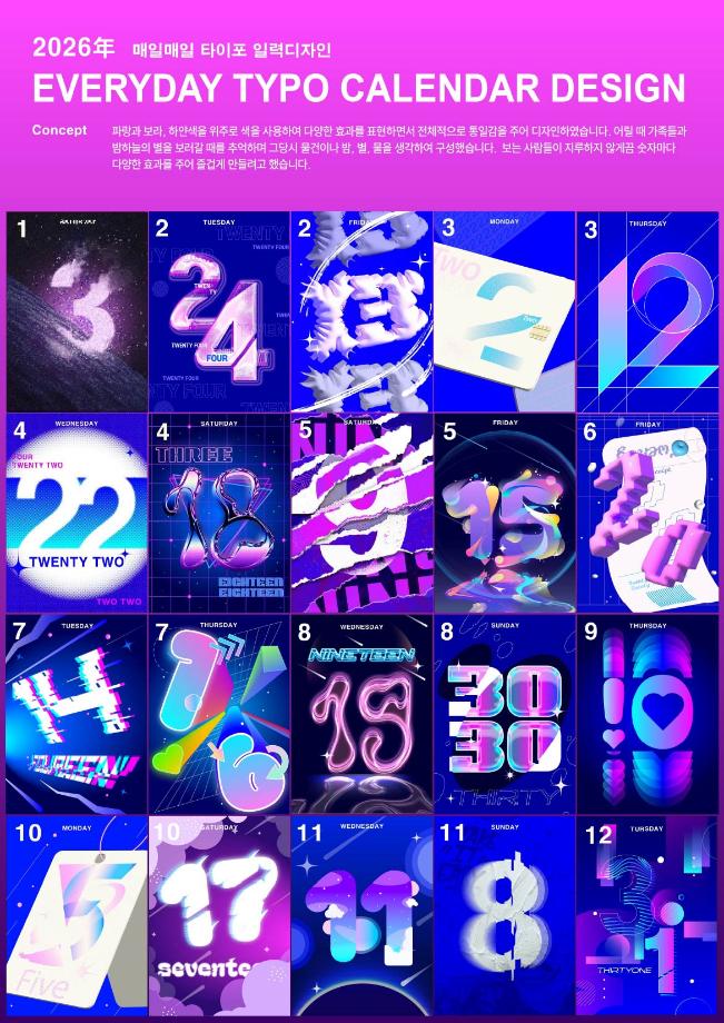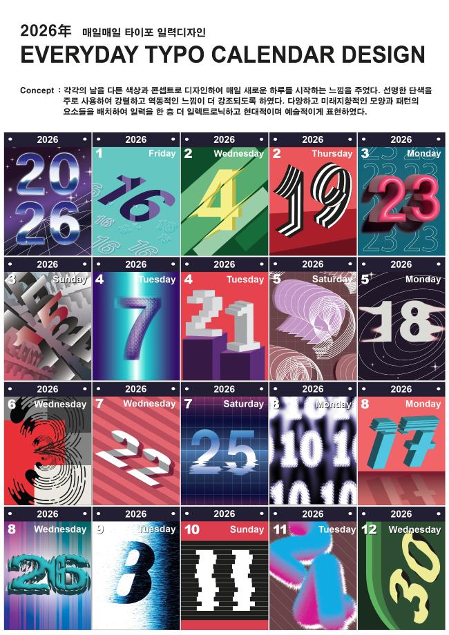 본문 시작 홈으로 학과자랑 학과소개 학과과정 시영소식 입학/취업 AI 학과자랑 SNS소통 홈페이지가이드 갤러리 학과자랑 갤러리 공모전 동아리 졸업전시회 갤러리 페이스북 트위터 프린트 과제전 1 - 타이포그래피(2학년 수업 과제 작품) 시각영상디자인학과 2520 2024-08-18 과제전 1 - 타이포그래피(2학년 수업 과제 작품) 목록 이전2024년 시각영상디자인학과 상반기 공모전 수상 실적 다음 과제전 2 - 드로잉(1학년 수업 과제 작품) 담당부서 : 시각영상디자인학과 담당자 : - 연락처 : 043-649-1726 최종수정일 : 2024-10-26 만족도조사 만족도 조사 이 페이지에서 제공하는 정보에 대하여 만족하시나요? 매우만족 만족 보통 불만족 매우불만족