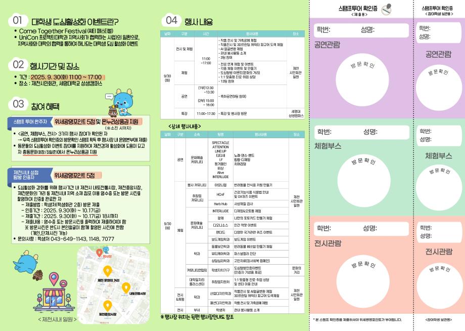 본문 시작 홈으로 학과생활 학과소개 교수소개 교과과정 학과생활 홈페이지가이드 사진게시판 공지사항 사진게시판 전공자료실 동아리 학과행사 사진게시판 페이스북 트위터 프린트 [학생처] 2025 대학생 도심활성화 이벤트[Come Together Festival(씨티페스티벌)] 개최 산업디자인학과 565 2025-09-24 학생처 목록 이전[기념품] 아트앤산업디자인학과 기념품 제작_에코백 다음 [세명대] 청룡체전 체험부스_산디과 동아리 활동 담당부서 : 산업디자인학과 담당자 : - 연락처 : 043-649-1436 최종수정일 : 2024-10-26 만족도조사 만족도 조사 이 페이지에서 제공하는 정보에 대하여 만족하시나요? 매우만족 만족 보통 불만족 매우불만족