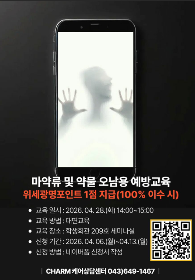 본문 시작 홈으로 학과생활 학과소개 교수소개 교과과정 학과생활 홈페이지가이드 사진게시판 공지사항 사진게시판 전공자료실 동아리 학과행사 사진게시판 페이스북 트위터 프린트 [CHARM케어상담센터] 2026학년도 1학기 "마약류 및 약물 오남용 예방교육" 실시 안내 아트앤산업디자인학과 37 2026-04-06 목록 이전[FABLAB] 3D펜을 나만의 키링 만들기 다음 [교양대학] 위세광명포인트 5점_ 2026학년도 1학기 “AI 활용능력 키우기” 수강생 모집 담당부서 : 산업디자인학과 담당자 : - 연락처 : 043-649-1436 최종수정일 : 2024-10-26 만족도조사 만족도 조사 이 페이지에서 제공하는 정보에 대하여 만족하시나요? 매우만족 만족 보통 불만족 매우불만족