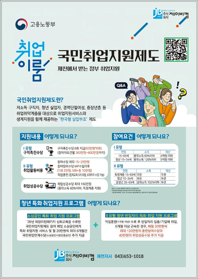 본문 시작 홈으로 학과생활 학과소개 교수소개 교과과정 학과생활 홈페이지가이드 사진게시판 공지사항 사진게시판 전공자료실 동아리 학과행사 사진게시판 페이스북 트위터 프린트 [취창업처] [2026대일플] 졸업(예정)자 대상 고용노동부 [국민취업지원제도] 사업 안내 아트앤산업디자인학과 47 2026-04-20 졸업(예정)자 대상 고용노동부 [국민취업지원제도] 사업 안내 1. 신청대상자 : 졸업(예정)자 2. 신청장소 : 대학일자리플러스센터 (학생회관 2층 202호) 3. 2026년부터는 구직촉진수당을 월 60만원으로 확대 지급 (구직촉진수당 6회 지급) 4. 국민취업지원제도 민간위탁기관 : 제이비컴 제천지사 043) 653-1018 목록 이전[기획실] 2026년 「긍정의+1」 다음 [CHARM케어상담센터 ] 2026학년도 1학기 알코올중독 예방교육 실시 담당부서 : 산업디자인학과 담당자 : - 연락처 : 043-649-1436 최종수정일 : 2024-10-26 만족도조사 만족도 조사 이 페이지에서 제공하는 정보에 대하여 만족하시나요? 매우만족 만족 보통 불만족 매우불만족