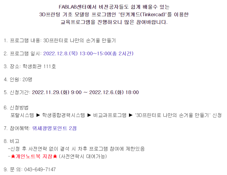 본문 시작 홈으로 학과생활 학과소개 교수소개 교과과정 학과생활 홈페이지가이드 사진게시판 공지사항 사진게시판 전공자료실 동아리 학과행사 사진게시판 페이스북 트위터 프린트 [FABLAB] 3D 프린터로 나만의 손거울 만들기 산업디자인학과 2869 2022-11-29 목록 이전[학술특강]성공하는 디자인 조건_Hitachi-LG DATA 디자인팀_우*호 팀장 다음 [FABLAB] 3D프린터를 활용한 지역-대학 협력형 평생교육 담당부서 : 산업디자인학과 담당자 : - 연락처 : 043-649-1436 최종수정일 : 2024-10-26 만족도조사 만족도 조사 이 페이지에서 제공하는 정보에 대하여 만족하시나요? 매우만족 만족 보통 불만족 매우불만족