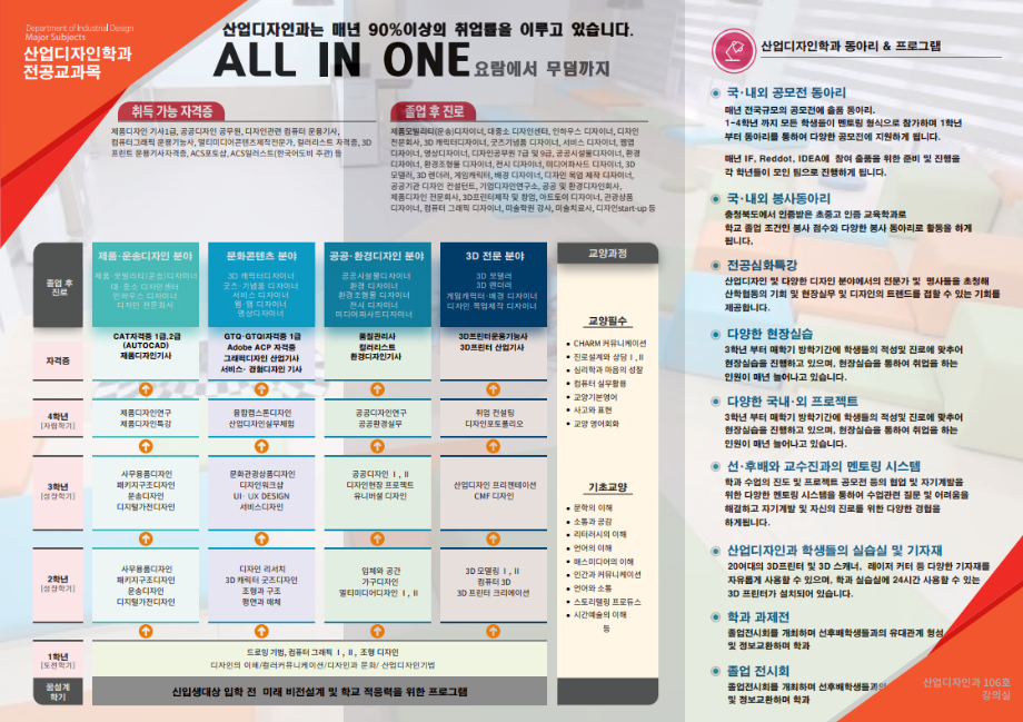 본문 시작 홈으로 학과생활 학과소개 교수소개 교과과정 학과생활 홈페이지가이드 사진게시판 공지사항 사진게시판 전공자료실 동아리 학과행사 사진게시판 페이스북 트위터 프린트 [브로셔] 2023년 산업디자인학과 소개 책자 산업디자인학과 3132 2023-09-12 목록 이전세명대 산업디자인학과를 졸업하고 무엇을 할 수 있나요?-공공/환경 디자이너 편! 다음 [졸업전시회] 2023학년도 4학년 졸업전시회 포스터 담당부서 : 산업디자인학과 담당자 : - 연락처 : 043-649-1436 최종수정일 : 2024-10-26 만족도조사 만족도 조사 이 페이지에서 제공하는 정보에 대하여 만족하시나요? 매우만족 만족 보통 불만족 매우불만족