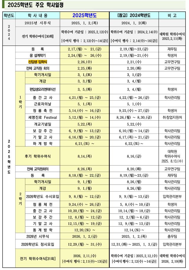 본문 시작 홈으로 학과생활 학과소개 교수소개 교과과정 학과생활 홈페이지가이드 사진게시판 공지사항 사진게시판 전공자료실 동아리 학과행사 사진게시판 페이스북 트위터 프린트 [교무처] 2025학년도 학사일정 산업디자인학과 867 2025-07-14 목록 이전[취창업처] 2025년 알쓸신잡 07월 1주차 다음 [취창업처] 2025년 알쓸신잡 07월 3주차 담당부서 : 산업디자인학과 담당자 : - 연락처 : 043-649-1436 최종수정일 : 2024-10-26 만족도조사 만족도 조사 이 페이지에서 제공하는 정보에 대하여 만족하시나요? 매우만족 만족 보통 불만족 매우불만족
