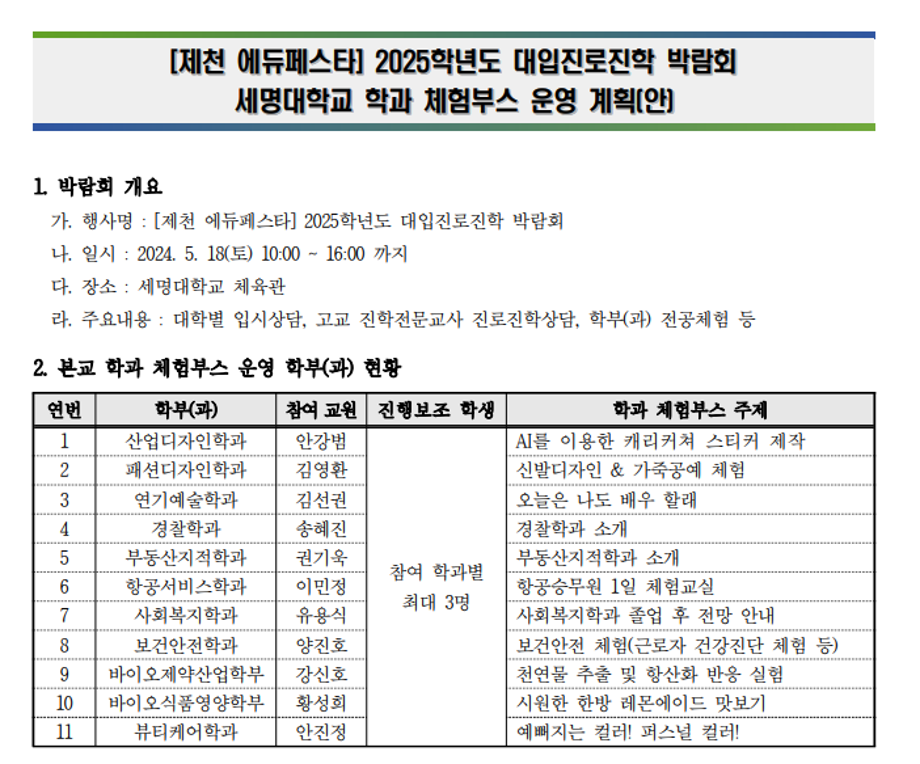 본문 시작 홈으로 커뮤니티 학과소개 교수소개 학과과정 커뮤니티 대학원 홈페이지가이드 포토갤러리 공지사항 채용정보 포토갤러리 Youtube 바로가기 Instargram 바로가기 Blog 바로가기 Facebook 바로가기 포토갤러리 페이스북 트위터 프린트 [제천 에듀페스타] 2025학년도 대입진로진학 박람회: 세명대학교 학과 체험부스 운영 뷰티케어학과 2091 2024-05-20 5월 18일 토요일, 세명대학교 체육관에서 2025학년도 대학 입시를 준비하고 있는 입시생들을 대상으로 한 진학 박람회가 열렸습니다. 우리 학과도 학과 체험부스를 운영하며 퍼스널 컬러 진단 프로그램을 진행했습니다:) 목록 이전㈜CCLIME(끌리메) 기업 설명회 다음 창업대체학점제 신청자를 모집