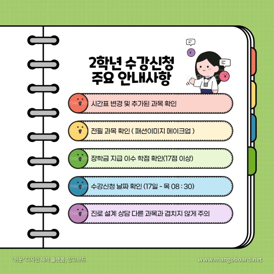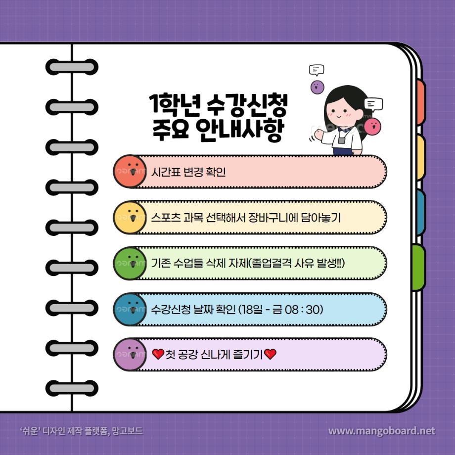 본문 시작 홈으로 커뮤니티 학과소개 교수소개 학과과정 커뮤니티 대학원 홈페이지가이드 포토갤러리 공지사항 채용정보 포토갤러리 Youtube 바로가기 Instargram 바로가기 Blog 바로가기 Facebook 바로가기 포토갤러리 페이스북 트위터 프린트 🌻2023년도 2학기 수강신청 안내 🌻 뷰티케어학 2737 2023-08-09 - 08. 09 ~ 08. 11 [장바구니] - 08. 17 ( 08 : 30 ) [2학년 수강신청] - 08. 18 ( 08 : 30)) [1학년 수강신청] 8월 18일은 모든 학년이 수강신청 가능합니다. 여러분 즐거운 방학 보내고 계신가요~? 수강신청이 얼마 남지 않은 지금 ! 이 내용 꼭 참고하셔서 좋은 결과 있길 바라겠습니다 💖 따로 궁금한 점이 있으시면 편하게 댓글 남겨주세요 ! 목록 이전원주 MBC 아카데미 뷰티스쿨 입시설명회 이전2023 세:티져 프로젝트 숏폼 콘텐츠 공모전