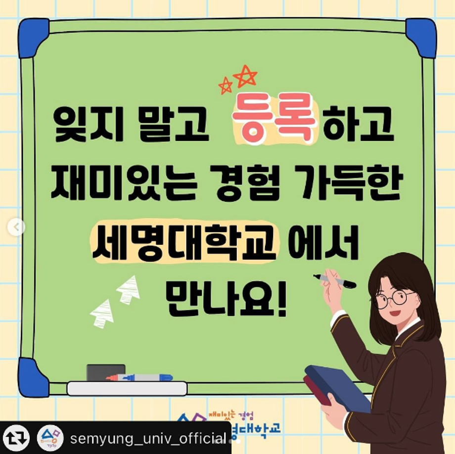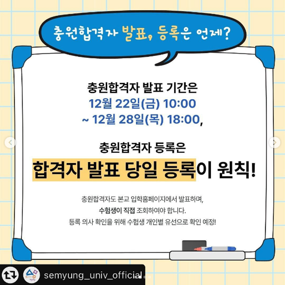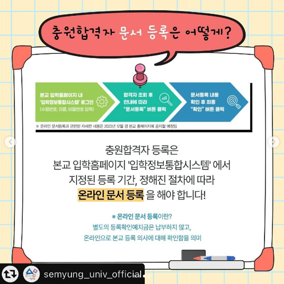 본문 시작 홈으로 커뮤니티 학과소개 교수소개 학과과정 커뮤니티 대학원 홈페이지가이드 포토갤러리 공지사항 채용정보 포토갤러리 Youtube 바로가기 Instargram 바로가기 Blog 바로가기 Facebook 바로가기 포토갤러리 페이스북 트위터 프린트 📢 2024학년도 세명대학교 수시모집 충원합격자 발표 및 등록 안내 뷰티케어학 2711 2023-12-22 2024학년도 수시모집 충원합격자 발표 및 등록 안내입니다👍 ✔12월 22일(금) 10:00부터 28일(금) 18:00✔까지 충원합격자 발표! 충원합격자 등록은 👉합격자 발표 당일 등록!!👈 잊지 말고 등록하고 ✨재미있는 경험 가득한 💙세명대학교💙에서 만나요! 목록 다음 더 가까워진 세명대학교! 다음 세명대학교도 지구를 위해 함께합니다!