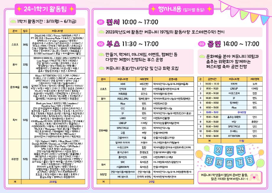 본문 시작 홈으로 커뮤니티 학과소개 교수소개 학과과정 커뮤니티 대학원 홈페이지가이드 포토갤러리 공지사항 채용정보 포토갤러리 Youtube 바로가기 Instargram 바로가기 Blog 바로가기 Facebook 바로가기 포토갤러리 페이스북 트위터 프린트 커뮤니티 페스티벌✨ 뷰티케어학 1841 2024-04-01 커뮤니티 페스티벌 4월 2~3일 봄을 맞아 새로운 행사가 열립니다! 여러 부스 활동들과 먹거리, 공연등이 펼쳐지니 많은 관심과 참여 부탁드립니다:) 전시,부스 종류와 공연시간등을 잘 참고하셔서 즐기시길 바래요✨ 전시-10:00~17:00 부스-11:30~17:00 공연-14:00~16:00 📍뭐든지 광장 (위치는 지도 참고) 목록 이전💫모듈형 교육과정 뷰티영양학 토론수업💫 다음 벚꽃세봄✨
