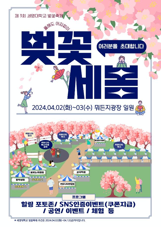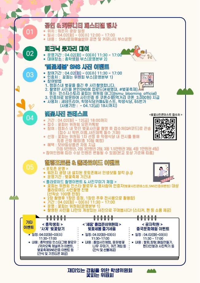 본문 시작 홈으로 커뮤니티 학과소개 교수소개 학과과정 커뮤니티 대학원 홈페이지가이드 포토갤러리 공지사항 채용정보 포토갤러리 Youtube 바로가기 Instargram 바로가기 Blog 바로가기 Facebook 바로가기 포토갤러리 페이스북 트위터 프린트 벚꽃세봄✨ 뷰티케어학 2025 2024-04-01 4월 2~3일, 봄을 맞아 새로운 행사가 열립니다! 여러 부스 활동들과 먹거리, 공연등이 펼쳐지니 많은 관심과 참여 부탁드립니다🩷 전시,부스 종류와 공연시간등을 잘 참고하셔서 즐기시길 바래요✨ 전시-10:00~17:00 부스-11:30~17:00 공연-14:00~16:00 📍뭐든지 광장 (위치는 지도 참고) 목록 이전커뮤니티 페스티벌✨ 다음 세명진로 festival 도전 특강: ‘레드오션에서 브랜드로 성공하는 마케팅’