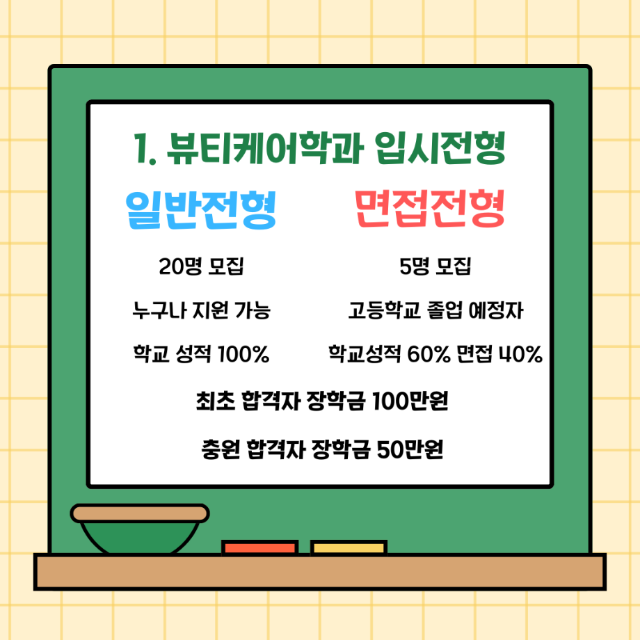본문 시작 홈으로 커뮤니티 학과소개 교수소개 학과과정 커뮤니티 대학원 홈페이지가이드 포토갤러리 공지사항 채용정보 포토갤러리 Youtube 바로가기 Instargram 바로가기 Blog 바로가기 Facebook 바로가기 포토갤러리 페이스북 트위터 프린트 2025학년도 신입생 수시 입시 모집요강 뷰티케어학과 2140 2024-06-11 벌써 한 해의 절반 이상이 지나갔네요! 올해 입학한 24 학번 새내기 분들이 이제 새내기 티를 벗어내고 내년 2025년도에 있을 새로운 신입생 분들을 마주 할 시간도 별로 남지 않았어요:) 2025에 새로 들어올 예비 신입생 분들을 위해 세명대학교 뷰티케어학과의 수시 모집요강에 관하여 간략하게 알아보도록 할게요 목록 이전뷰티케어학과 2024년도 SMU연계프로그램 다음 뷰티케어학과 청주SBS뷰티아카데미 입시설명회
