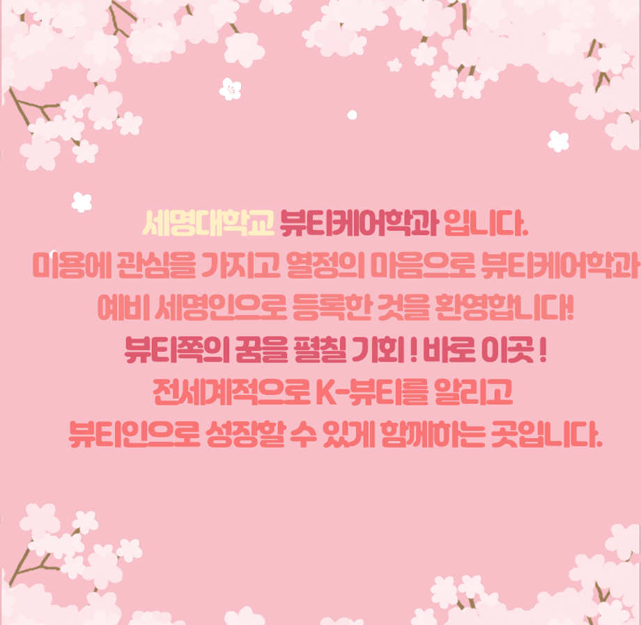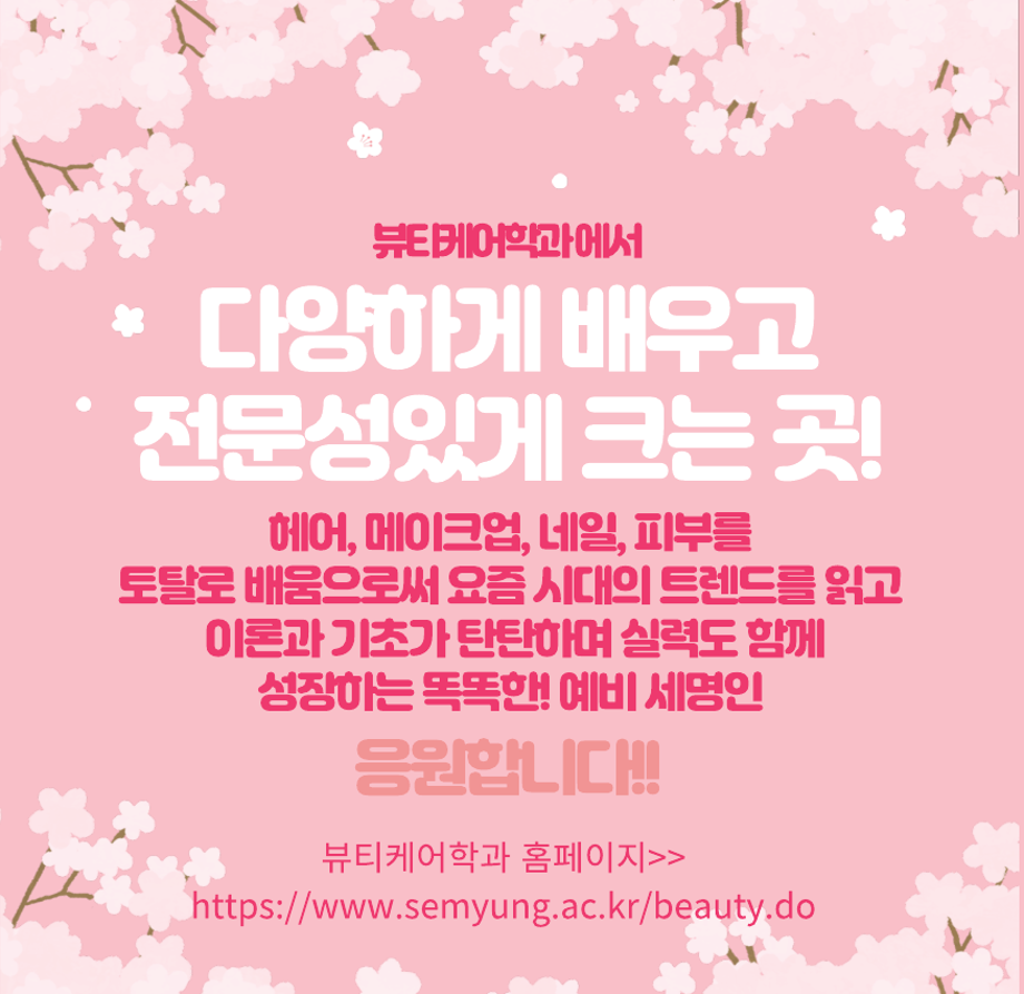 본문 시작 홈으로 커뮤니티 학과소개 교수소개 학과과정 커뮤니티 대학원 홈페이지가이드 포토갤러리 공지사항 채용정보 포토갤러리 Youtube 바로가기 Instargram 바로가기 Blog 바로가기 Facebook 바로가기 포토갤러리 페이스북 트위터 프린트 예비smu뷰티케어학과 학생들 반가워요!! 뷰티케어학과 1794 2024-09-10 우리 함꼐 멋진 미용인으로 성장합시다! 목록 이전09.09 ~ 09.13 세명대학교 수시모집 기긴입니다. 다음 043-649-1637 / 2025학년도 예비 신입생 여러분들께 수시 입시 무료 응시쿠폰(진학사,유웨이어플라이무료)을 드립니다.