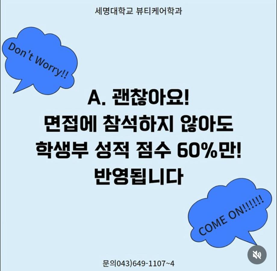 본문 시작 홈으로 커뮤니티 학과소개 교수소개 학과과정 커뮤니티 대학원 홈페이지가이드 포토갤러리 공지사항 채용정보 포토갤러리 Youtube 바로가기 Instargram 바로가기 Blog 바로가기 Facebook 바로가기 포토갤러리 페이스북 트위터 프린트 면접 우수자 전형 바이오코스메틱학과 1727 2024-10-02 📍면접우수자전형 면접에 응시하지 않아도! 괜찮습니다! 걱정하시마세요~ 다만 면접에 참석하지 않을시, 학생부 성적 점수 60%만 반영되니까 꼭 알아두고! 충분히 생각하고 결정합시다!! . 목록 이전043-649-1637 / 2025학년도 예비 신입생 여러분들께 수시 입시 무료 응시쿠폰(진학사,유웨이어플라이무료)을 드립니다. 다음 📣 2025 세명대학교 “뷰티케어학과” 면접우수자전형 면접 일정 📣