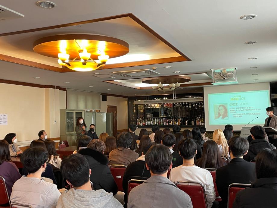- 현재 COVID-19 사태가 지속되어 학교 적응 및 학과에 대한 소속감을 키우고 동시에 각 지도교수님과의 대면상담을 통하여 교수님과의 관계형성에도 도움을 주고자 교수님 및 학과 학생회분들이 좋은 자리를 마련함.