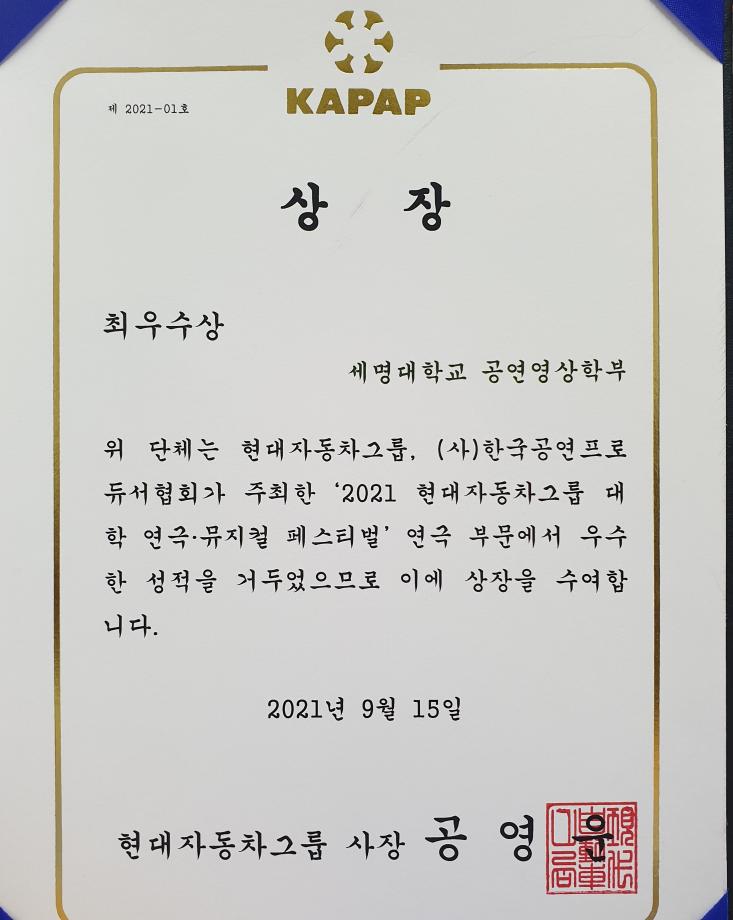 본문 시작 홈으로 커뮤니티 학과소개 입학정보 교수소개 학과과정 커뮤니티 공연예매 안내 홈페이지가이드 포토갤러리 공지사항 포토갤러리 작품DB 동아리 학사일정 학생회 포토갤러리 페이스북 트위터 프린트 현대차 그룹 대학 연극.뮤지컬 페스티벌 2021학년도 젊은연극제 참가작 <맥베스>최우수상 수상 연기예술학과 3547 2021-09-27 현대차 그룹 대학 연극.뮤지컬 페스티벌에 2021학년도 젊은연극제 참가작 <맥베스>가 최우수상을 수상하였습니다. 수상하신 맥베스 참가 학과생들, 진심으로 축하드립니다~ 목록 이전2021학년도 제29회 젊은연극제 참가작 <맥베스> 다음 2021학년도 2학기 과체전 담당부서 : 연기예술학과 담당자 : - 연락처 : 043-649-1733 최종수정일 : 2024-10-26 만족도조사 만족도 조사 이 페이지에서 제공하는 정보에 대하여 만족하시나요? 매우만족 만족 보통 불만족 매우불만족
