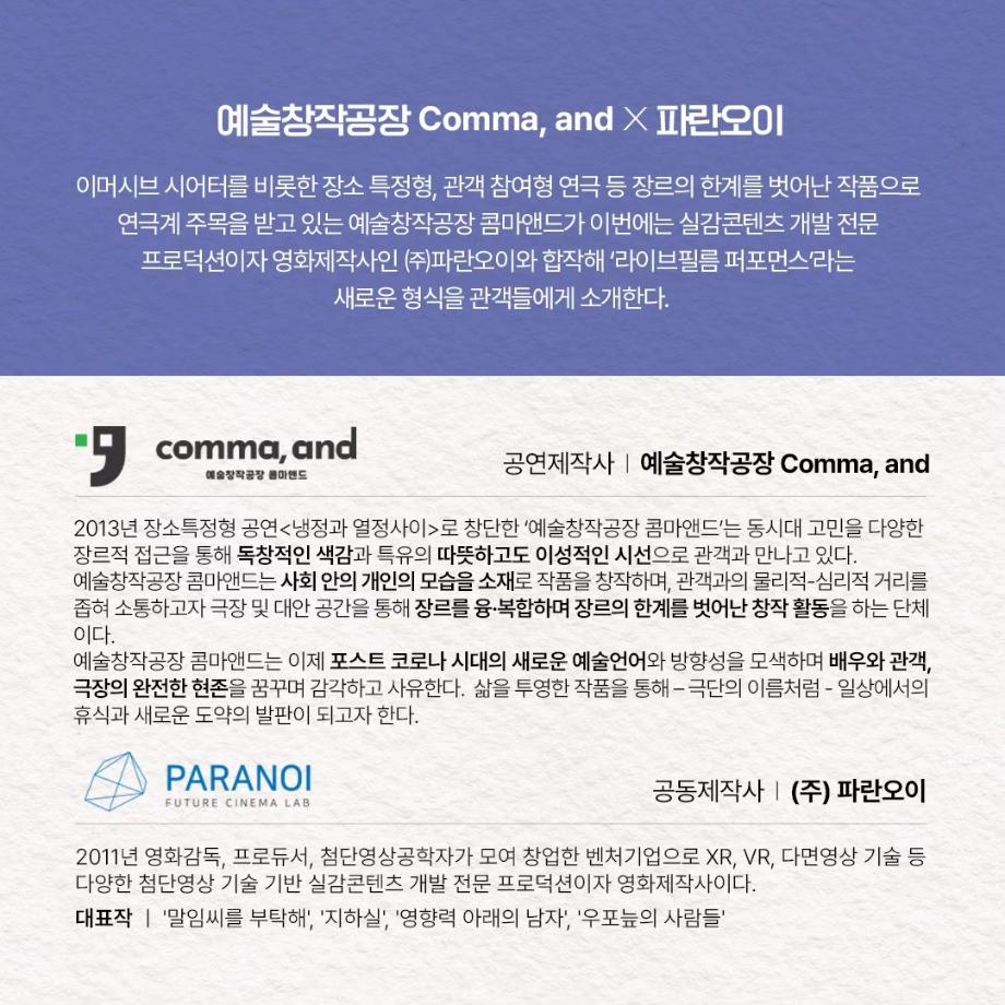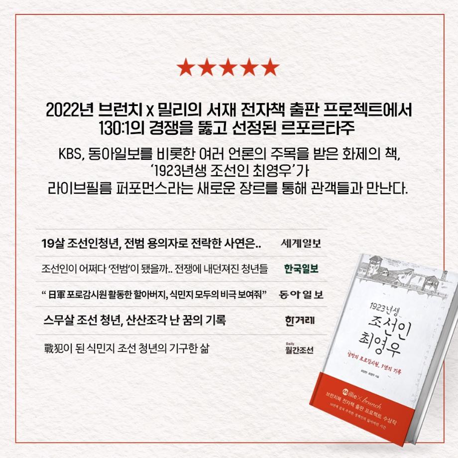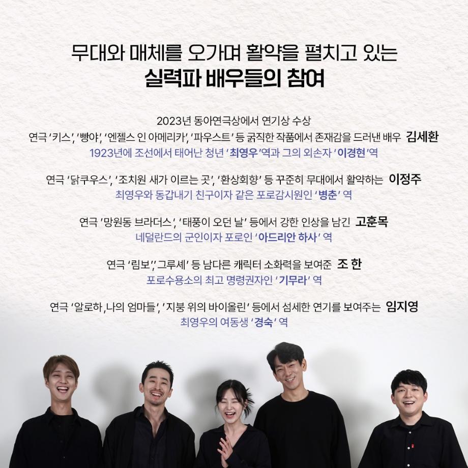 본문 시작 홈으로 커뮤니티 학과소개 입학정보 교수소개 학과과정 커뮤니티 공연예매 안내 홈페이지가이드 포토갤러리 공지사항 포토갤러리 작품DB 동아리 학사일정 학생회 포토갤러리 페이스북 트위터 프린트 이지은 교수님 연출작품 <1923년생 조선인 최영우> 연기예술학과 3486 2023-07-11 이지은(이태린) 교수님이 연출하신 <1923년생 조선인 최영우>가 2023년 한국문화예술위원회 예술과 기술융합 지원사업에 선정되어 이번에 공연을 올립니다. 2023.07.14. - 07.16 금 20:00 / 토 15:00, 19:00 / 일 15:00 동국대 이해랑예술극장 출연 : 김세환, 이정주, 고훈목, 조한, 임지영 극작 : 최양현 / 연출 : 이태린 주최/주관 예술창작공장 콤마앤드 @commaand2013 많은 관심 부탁드립니다. 목록 이전사이와의 인터뷰 - 23년도 조명장 ‘김은경‘ 다음 2023학년도 2학기 표준현장실습 학생신청 안내 담당부서 : 연기예술학과 담당자 : - 연락처 : 043-649-1733 최종수정일 : 2024-10-26 만족도조사 만족도 조사 이 페이지에서 제공하는 정보에 대하여 만족하시나요? 매우만족 만족 보통 불만족 매우불만족