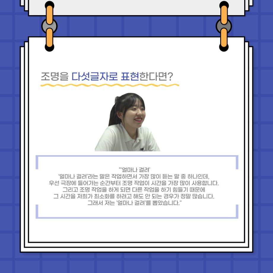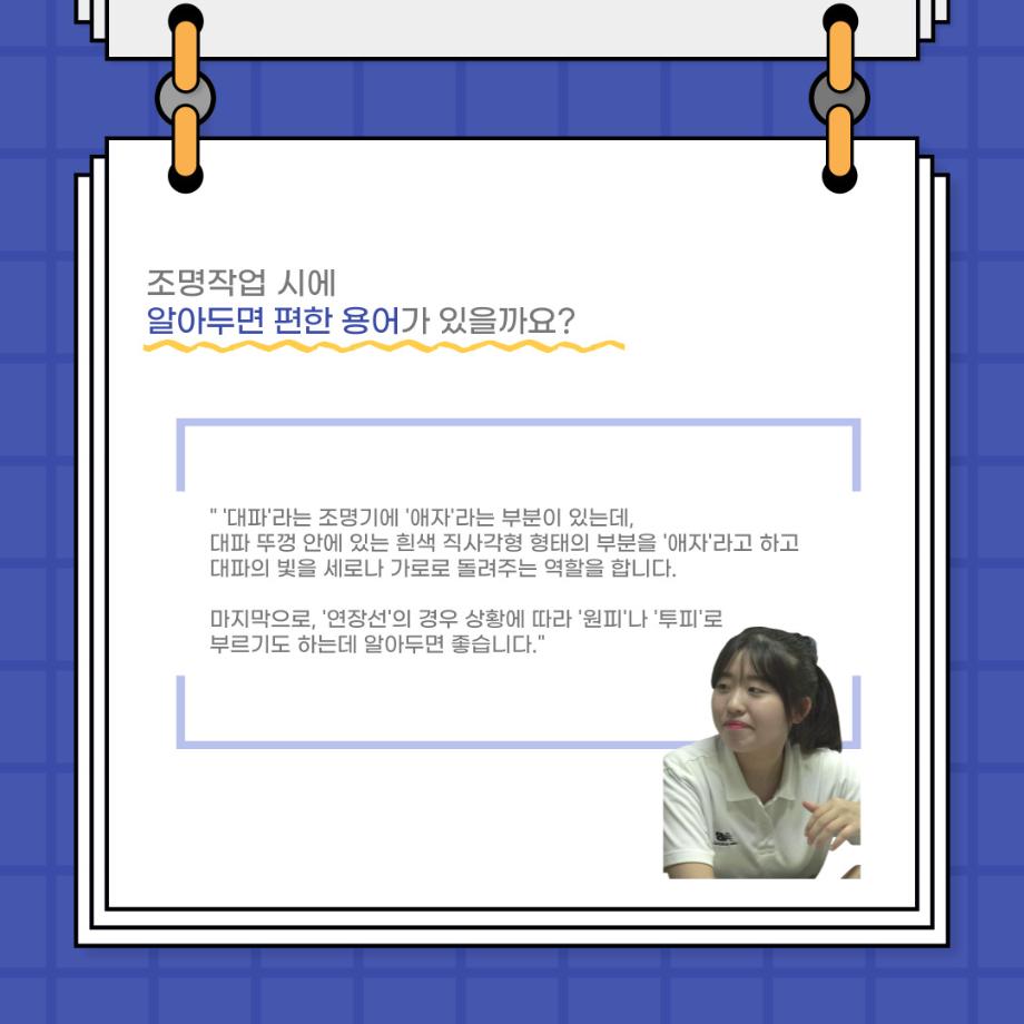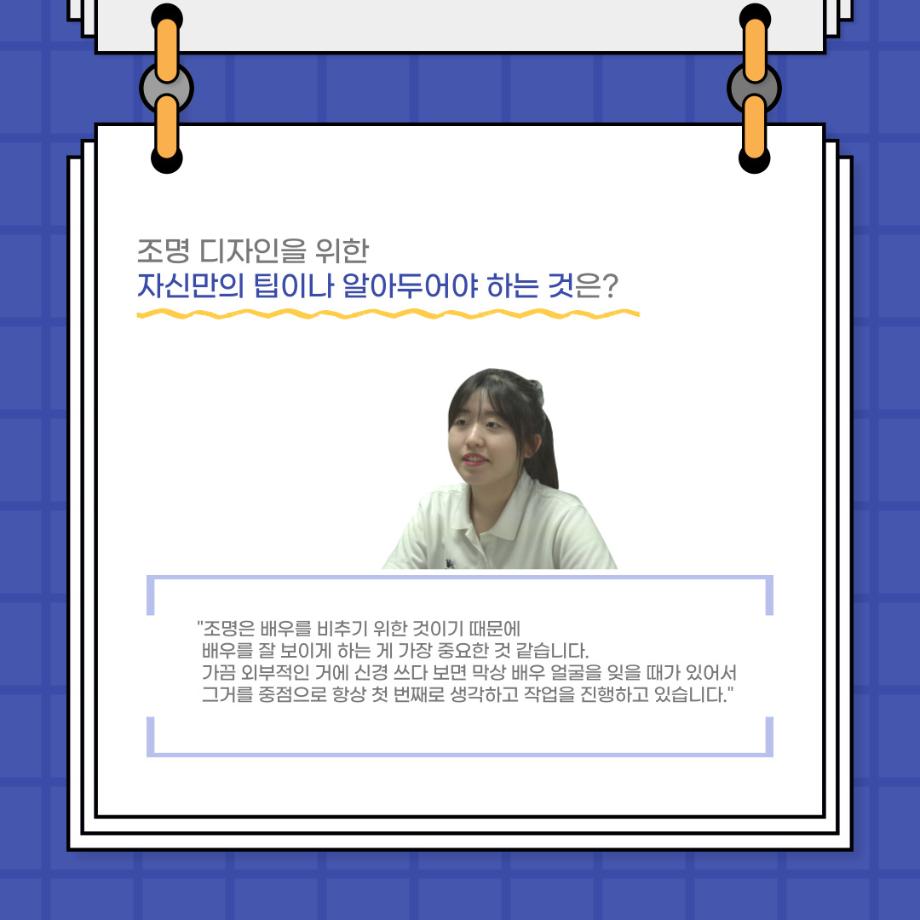 본문 시작 홈으로 커뮤니티 학과소개 입학정보 교수소개 학과과정 커뮤니티 공연예매 안내 홈페이지가이드 포토갤러리 공지사항 포토갤러리 작품DB 동아리 학사일정 학생회 포토갤러리 페이스북 트위터 프린트 사이와의 인터뷰 - 23년도 조명사수 ‘오승아‘ 연기예술학과 3544 2023-07-13 안녕하십니까! 23년도 학회 ‘사이’입니다! 학회 ‘사이’의 네번째 인터뷰로 연기예술학과 23년도 조명 사수인 오승아 학생과 인터뷰를 진행했습니다. 이번 인터뷰에서는 조명에 대한 매력과 조명 작업에서 가장 중요한 것, 조명 작업에서 알아두어야 하는 것 등 다양한 인터뷰를 진행하였습니다. 앞으로 있을 인터뷰 컨텐츠 ‘사인’ 많은 사랑 부탁드립니다. 목록 이전2023학년도 1학기 MCI 다면적진로탐색검사 실시 안내 이전제 94회 세명대학교 연기예술학과 정기공연 1학년 기초연기 물체 없는 행동 발표회<백지의 공백> 담당부서 : 연기예술학과 담당자 : - 연락처 : 043-649-1733 최종수정일 : 2024-10-26 만족도조사 만족도 조사 이 페이지에서 제공하는 정보에 대하여 만족하시나요? 매우만족 만족 보통 불만족 매우불만족