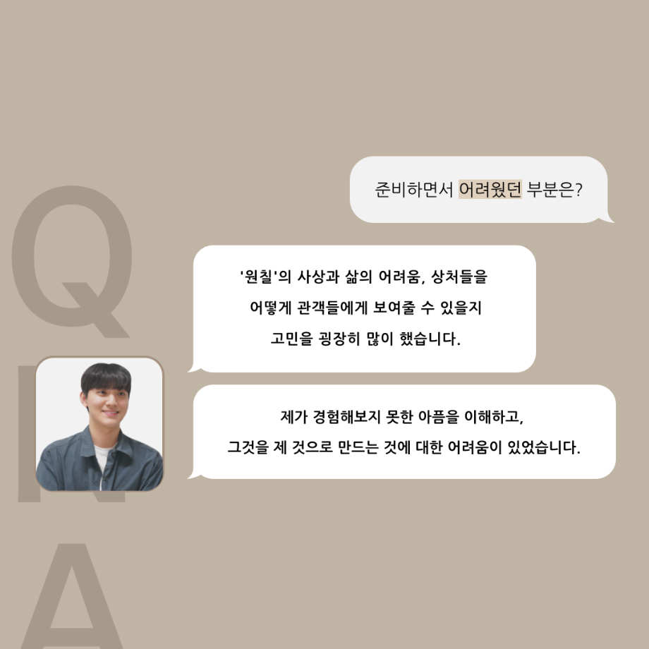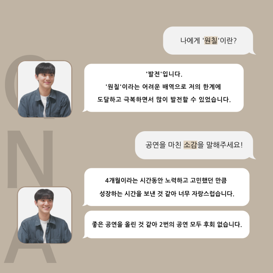 본문 시작 홈으로 커뮤니티 학과소개 입학정보 교수소개 학과과정 커뮤니티 공연예매 안내 홈페이지가이드 포토갤러리 공지사항 포토갤러리 작품DB 동아리 학사일정 학생회 포토갤러리 페이스북 트위터 프린트 '품'위있는 인'터뷰' - 24년도 젊은연극제 원칠役 <김은혁> 연기예술학과 3402 2024-08-13 안녕하십니까. 24년도 학회 ‘품’ 입니다. 학회 ‘품’의 열 두 번째 인터뷰로 세명대학교 연기예술학과 24학년도 젊은연극제 참가작 <혈맥> 원칠 역인 김은혁 학우와 인터뷰 하는 시간을 가졌습니다. 가장 좋아하는 장면, 자신의 배역을 제외하고 해보고 싶은 배역 그리고 준비하면서 어려웠던 부분과 공연을 마친 소감 등에 대해 인터뷰 하는 시간을 가졌습니다. 앞으로 있을 인터뷰 컨텐츠인 ‘품터뷰’ 많은 사랑 부탁드립니다. 목록 이전제6회 세명진로 Festival 대면 특강 안내 다음 연기예술학과 108회 정기공연 하계 프로젝트 <도덕적 도둑> 프로필 스틸컷 담당부서 : 연기예술학과 담당자 : - 연락처 : 043-649-1733 최종수정일 : 2024-10-26 만족도조사 만족도 조사 이 페이지에서 제공하는 정보에 대하여 만족하시나요? 매우만족 만족 보통 불만족 매우불만족
