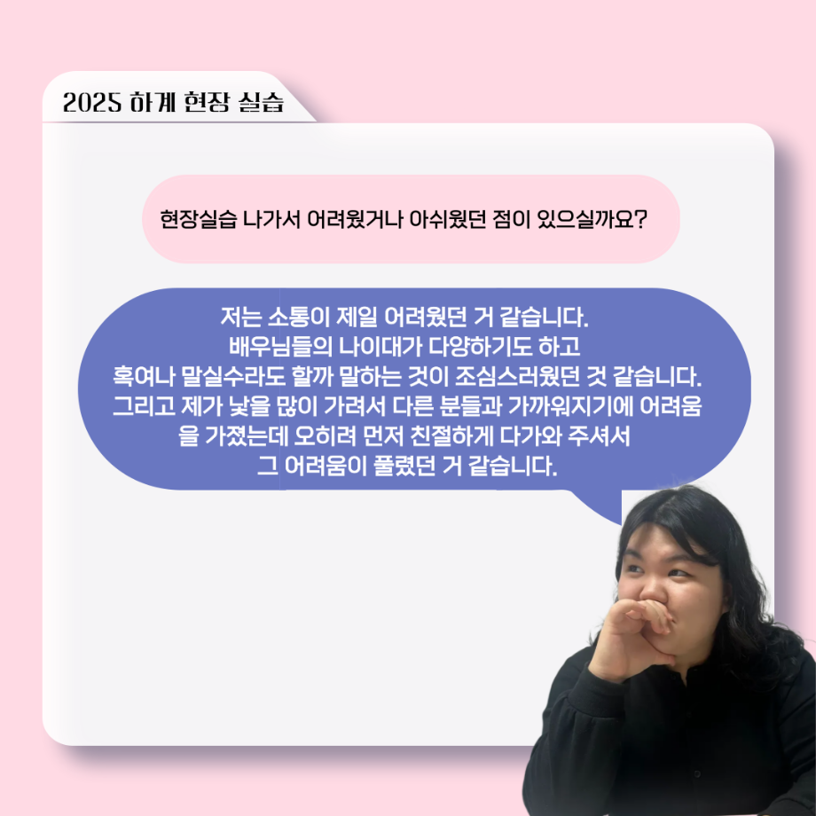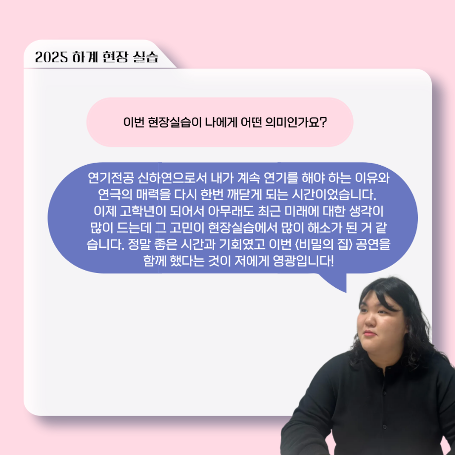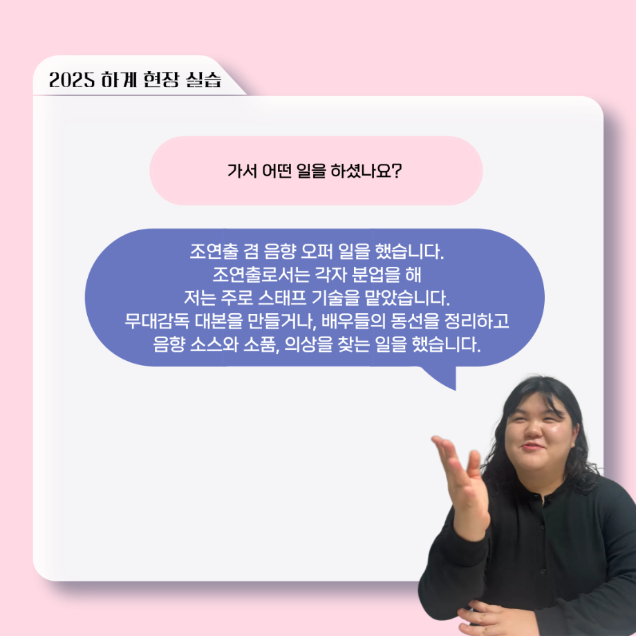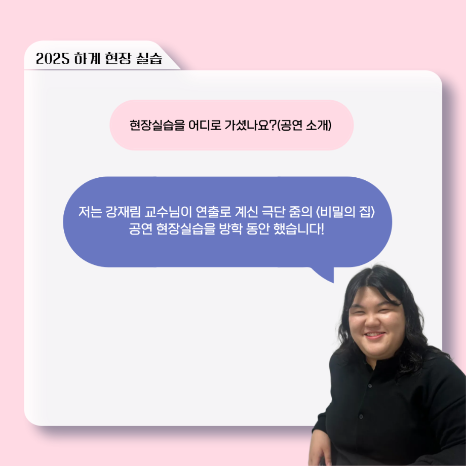 본문 시작 홈으로 커뮤니티 학과소개 입학정보 교수소개 학과과정 커뮤니티 공연예매 안내 홈페이지가이드 포토갤러리 공지사항 포토갤러리 작품DB 동아리 학사일정 학생회 포토갤러리 페이스북 트위터 프린트 ‘늘‘ 궁금한 이야기 - 현장실습 < 신하연 > 연기예술학과 976 2025-10-16 . 목록 이전117회 세명대학교 연기예술학과 하계프로젝트 사랑의 온도 배우 소개 다음 ‘늘‘ 궁금한 이야기 - 하계 프로젝트 ‘컨택’팀 고진役 < 조진석 > 담당부서 : 연기예술학과 담당자 : - 연락처 : 043-649-1733 최종수정일 : 2024-10-26 만족도조사 만족도 조사 이 페이지에서 제공하는 정보에 대하여 만족하시나요? 매우만족 만족 보통 불만족 매우불만족