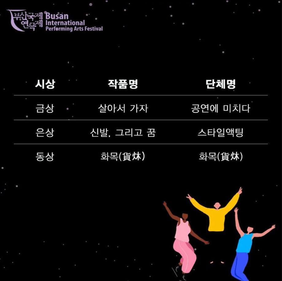 본문 시작 홈으로 커뮤니티 학과소개 입학정보 교수소개 학과과정 커뮤니티 공연예매 안내 홈페이지가이드 포토갤러리 공지사항 포토갤러리 작품DB 동아리 학사일정 학생회 포토갤러리 페이스북 트위터 프린트 🏆2022년 제19회 부산국제연극제 청년연극제 금상수상🏆 연기예술학과 2842 2022-06-22 🏆2022년 제19회 부산국제연극제 청년연극제 금상수상🏆 🌺이번 청년연극제 참가작인 [살아서 가자]는 신입생들과 2학년 학생들이 액션신과 군무 등 함께 호흡을 맞춰 즐겁게 연습했던 작품으로 금상까지 수상하게 되었습니다👥🎉🎉 열심히 연습하고 노력한 '살아서 가자' 팀에게 박수를 보냅니다👏👏 또한 이번 청년연극제에서 수상 받을 수 있도록 유튜브도 찾아보고 응원해준 모든 사람들에게 감사드립니다! 🔥 축하드립니다 🔥 목록 이전🏫[커버 COVER] 2022 High School Musical 세명대학교 연기예술학과 2022 무용동아리 프로젝트 화란&ATTENTION🏫 이전제 82회 세명대학교 연기예술학과 정기공연 중급연기 | 발표 <팔레트> 스틸컷🎨📸 담당부서 : 연기예술학과 담당자 : - 연락처 : 043-649-1733 최종수정일 : 2024-10-26 만족도조사 만족도 조사 이 페이지에서 제공하는 정보에 대하여 만족하시나요? 매우만족 만족 보통 불만족 매우불만족