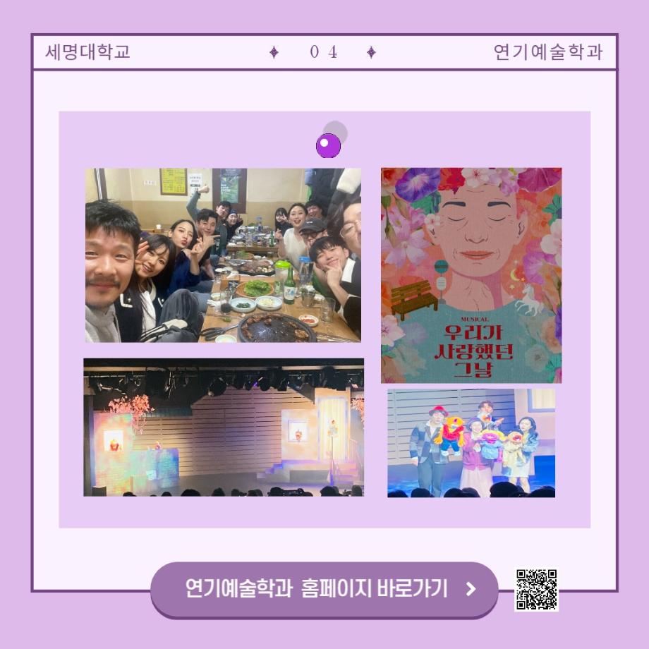 세명대학교 연기예술학과는 많은 극단, 단체와 MOU협약을 체결해 학생들이 현장실습을 비롯한 다양한 실무경험을 할 수 있도록 적극 지원하고 있습니다.👍🏻