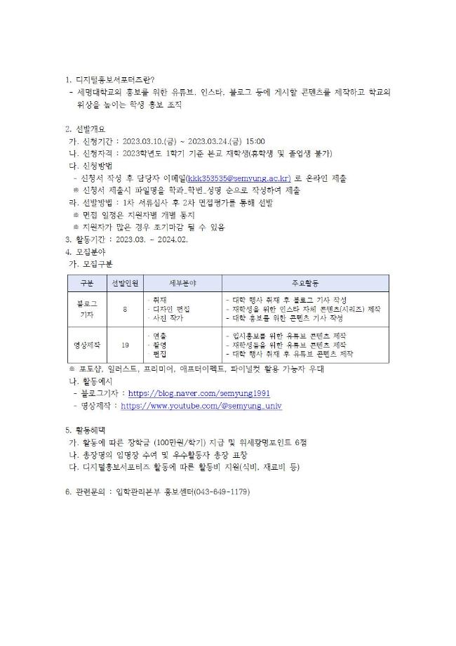 본문 시작 홈으로 커뮤니티 학과소개 입학정보 교수소개 학과과정 커뮤니티 공연예매 안내 홈페이지가이드 포토갤러리 공지사항 포토갤러리 작품DB 동아리 학사일정 학생회 포토갤러리 페이스북 트위터 프린트 2023학년도 세명대학교 디지털 홍보 서포터즈 연기예술학과 2635 2023-03-14 2023학년도 세명대학교 디지털 홍보 서포터즈 목록 이전2023학년도 1학기 개강총회 안내문 다음 2023학년도 학생위원회 신규위원 모집 담당부서 : 연기예술학과 담당자 : - 연락처 : 043-649-1733 최종수정일 : 2024-10-26 만족도조사 만족도 조사 이 페이지에서 제공하는 정보에 대하여 만족하시나요? 매우만족 만족 보통 불만족 매우불만족