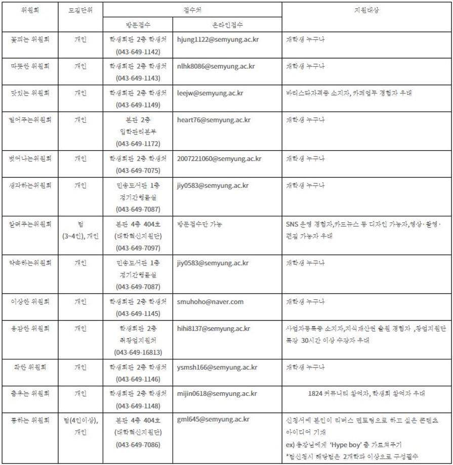 본문 시작 홈으로 커뮤니티 학과소개 입학정보 교수소개 학과과정 커뮤니티 공연예매 안내 홈페이지가이드 포토갤러리 공지사항 포토갤러리 작품DB 동아리 학사일정 학생회 포토갤러리 페이스북 트위터 프린트 2023학년도 학생위원회 신규위원 모집 연기예술학과 2643 2023-03-15 2023학년도 학생위원회 신규위원 모집 목록 이전2023학년도 세명대학교 디지털 홍보 서포터즈 다음 2023학년도 대학생 청소년교육지원사업 장학생 모집 안내 담당부서 : 연기예술학과 담당자 : - 연락처 : 043-649-1733 최종수정일 : 2024-10-26 만족도조사 만족도 조사 이 페이지에서 제공하는 정보에 대하여 만족하시나요? 매우만족 만족 보통 불만족 매우불만족