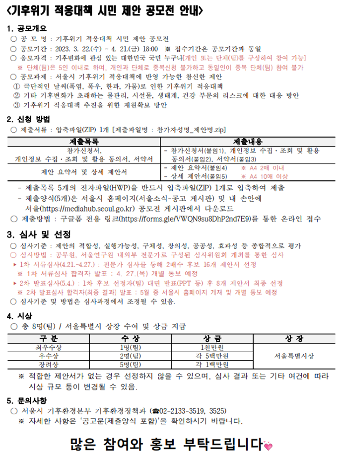 본문 시작 홈으로 커뮤니티 학과소개 입학정보 교수소개 학과과정 커뮤니티 공연예매 안내 홈페이지가이드 포토갤러리 공지사항 포토갤러리 작품DB 동아리 학사일정 학생회 포토갤러리 페이스북 트위터 프린트 「기후위기 적응대책 시민 제안 공모전」 안내 연기예술학과 2755 2023-04-13 「기후위기 적응대책 시민 제안 공모전」 안내 목록 이전2023학년도제8회 장애인식개선 UCC 공모전 시행 안내 다음 농촌신활력플러스사업 점프-업 액션그룹 양성 프로그램 도움닫기 과정 모집 담당부서 : 연기예술학과 담당자 : - 연락처 : 043-649-1733 최종수정일 : 2024-10-26 만족도조사 만족도 조사 이 페이지에서 제공하는 정보에 대하여 만족하시나요? 매우만족 만족 보통 불만족 매우불만족