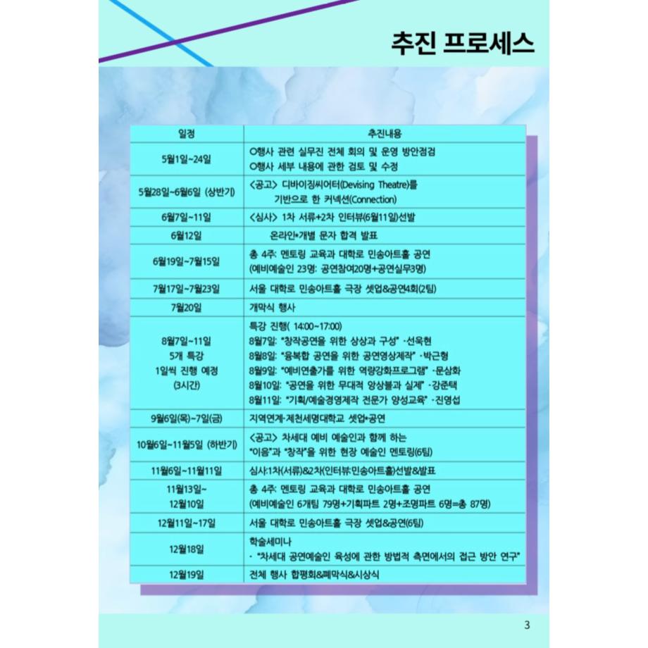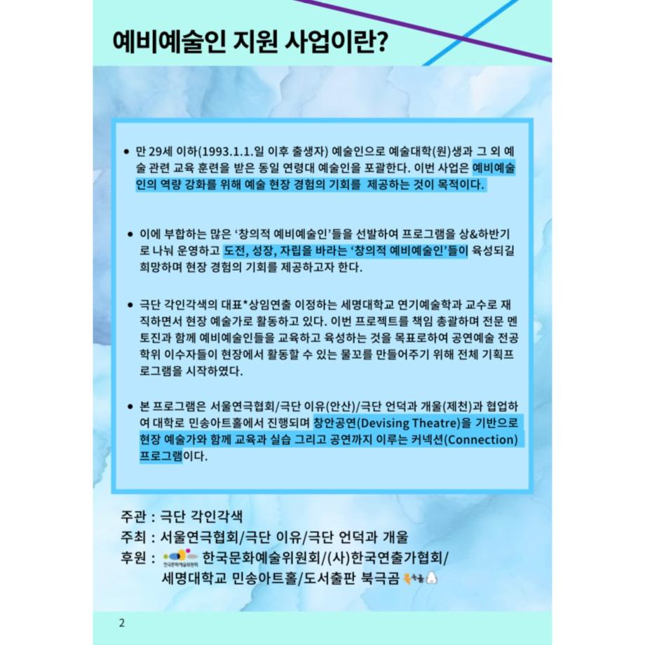 <잇다! 그리고 창작하다>는 예비예술인 지원 사업으로 만 29세 이하 (1993.1.1. 이후 출생자) 예술인으로 예술대학(원)생과 그 외 예술 관련 교육을 받은 동일 연령대 예술인을 포괄합니다.