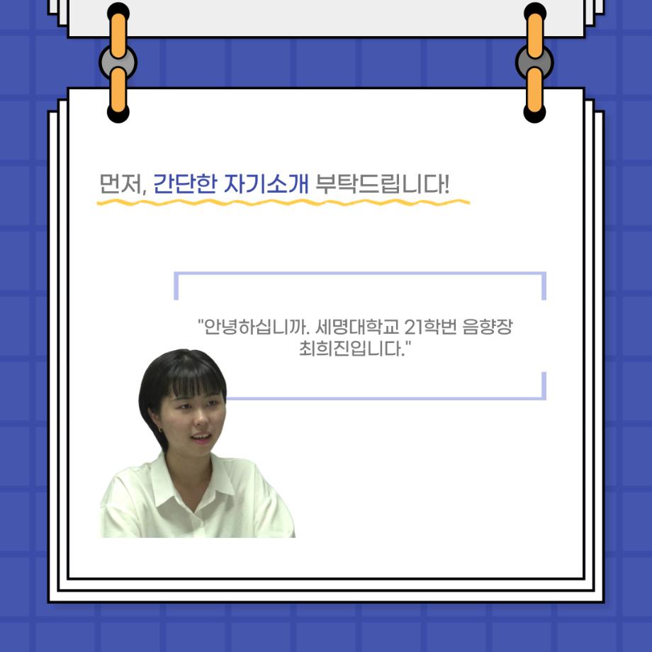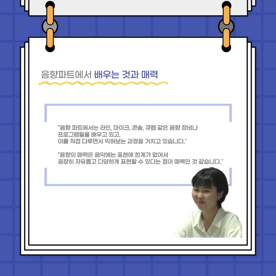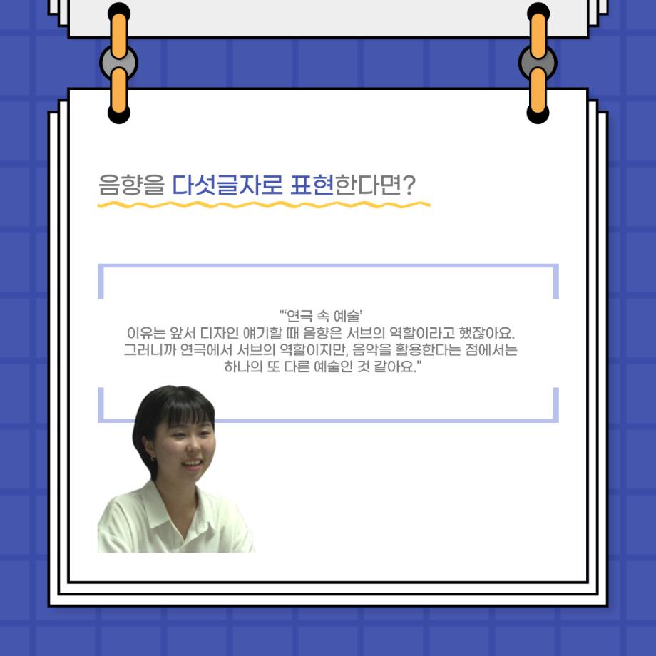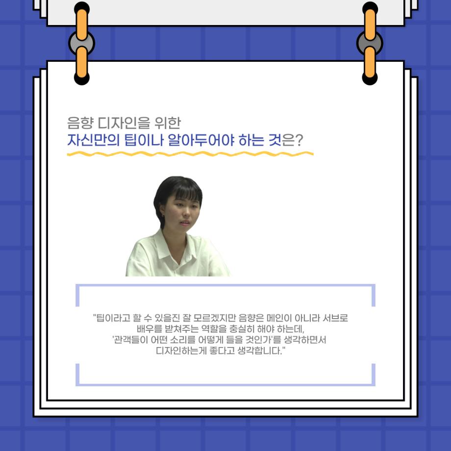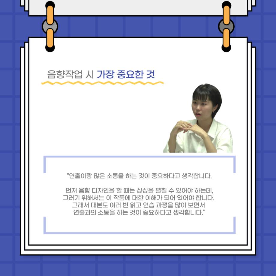 본문 시작 홈으로 커뮤니티 학과소개 입학정보 교수소개 학과과정 커뮤니티 공연예매 안내 홈페이지가이드 포토갤러리 공지사항 포토갤러리 작품DB 동아리 학사일정 학생회 포토갤러리 페이스북 트위터 프린트 사이와의 인터뷰 - 23년도 음향장 ‘최희진‘ 연기예술학과 3325 2023-07-24 안녕하십니까! 23년도 학회 ‘사이’입니다! 학회 ‘사이’의 다섯번째 인터뷰로 연기예술학과 23년도 음향장인 최희진 학생과 인터뷰하는 시간을 가졌습니다! 이번 인터뷰에서는 음향에 대한 매력과 음향 작업에서 가장 중요한 것, 음향 작업에서 알아두어야 하는 것 등에 대해 인터뷰하였습니 앞으로 있을 인터뷰 컨텐츠 ‘사인’도 많은 사랑 부탁드립니다. 목록 이전제 97회 세명대학교 연기예술학과 정기공연 하계 프로젝트 < 첼로와 케찹 > 다음 제 98회 세명대학교 연기예술학과 정기공연 하계 프로젝트 - < 하녀들 > 담당부서 : 연기예술학과 담당자 : - 연락처 : 043-649-1733 최종수정일 : 2024-10-26 만족도조사 만족도 조사 이 페이지에서 제공하는 정보에 대하여 만족하시나요? 매우만족 만족 보통 불만족 매우불만족