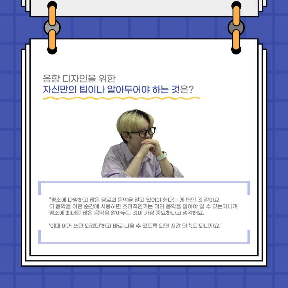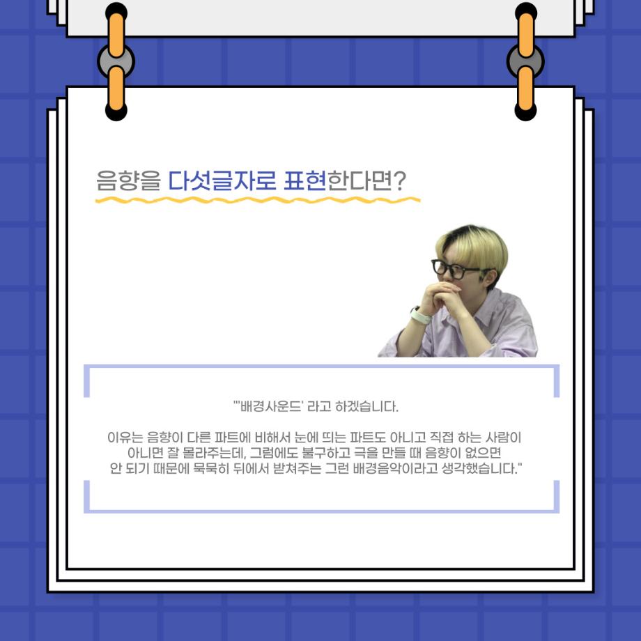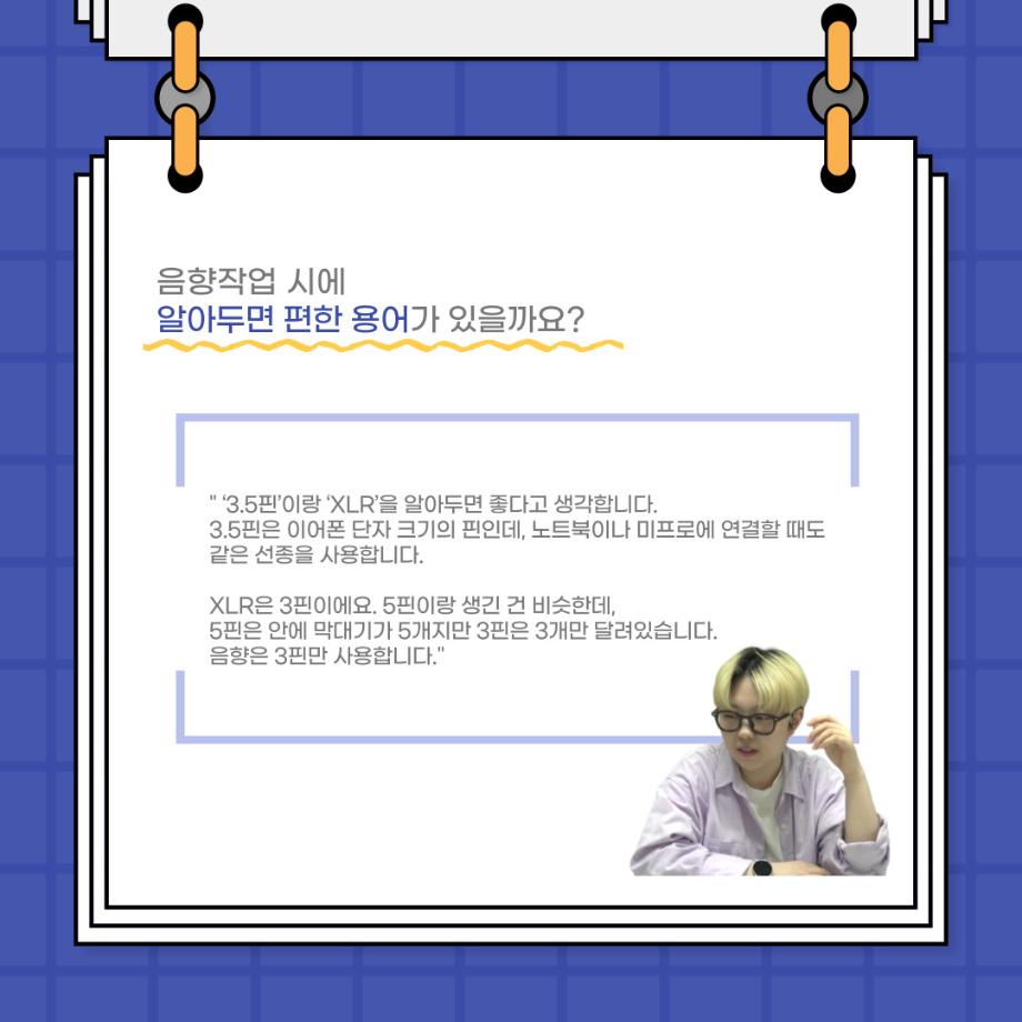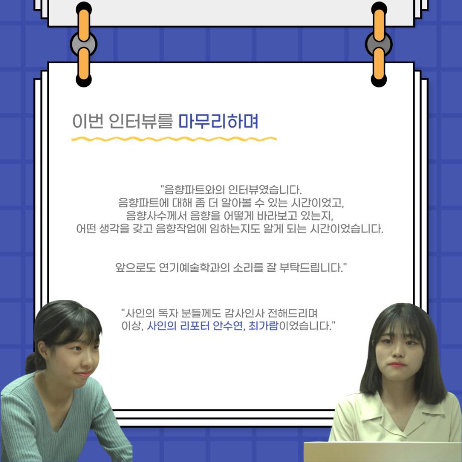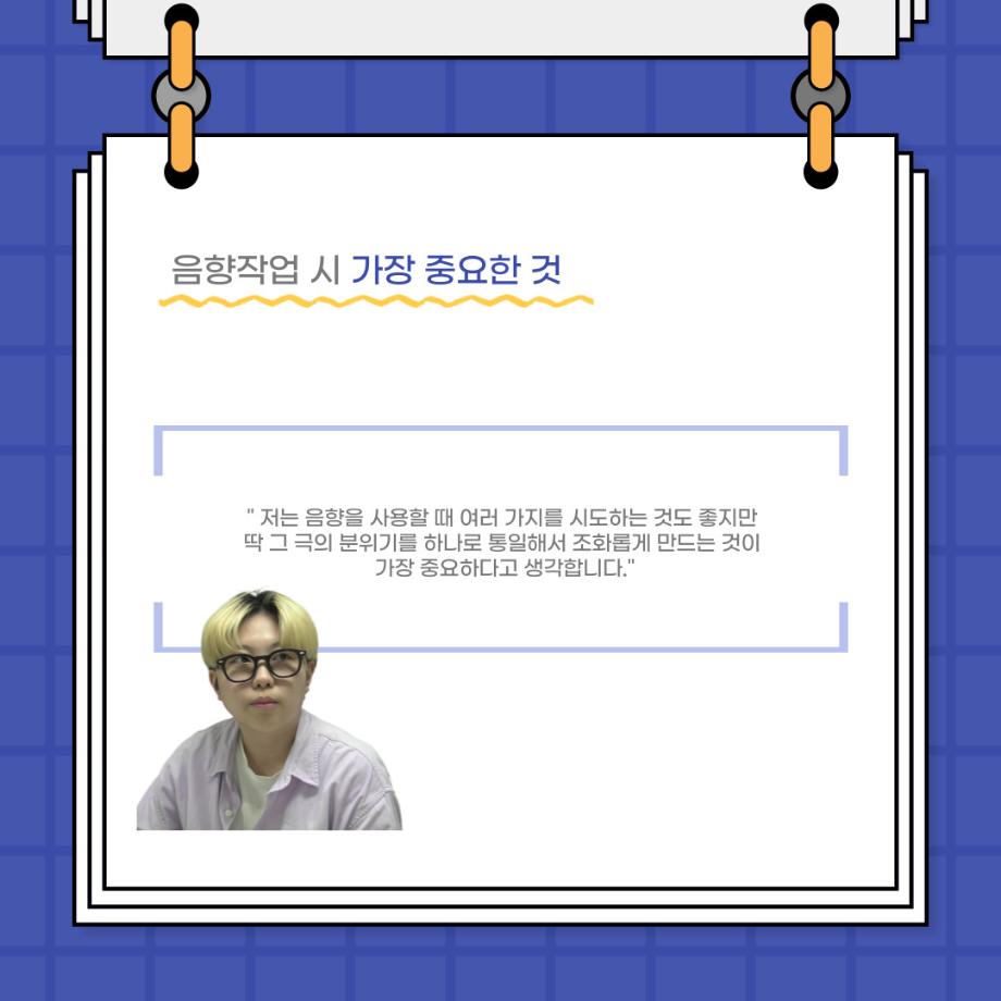 본문 시작 홈으로 커뮤니티 학과소개 입학정보 교수소개 학과과정 커뮤니티 공연예매 안내 홈페이지가이드 포토갤러리 공지사항 포토갤러리 작품DB 동아리 학사일정 학생회 포토갤러리 페이스북 트위터 프린트 사이와의 인터뷰 - 23년도 음향 사수 '임소정' 연기예술학과 3616 2023-08-09 안녕하십니까. 23년도 학회 ‘사이’입니다. 학회 ‘사이’의 여섯번째 인터뷰로 연기예술학과 23년도 음향 사수인 임소정 학생과 인터뷰하는 시간을 가졌습니다. 이번 인터뷰에서는 음향에 대한 매력과 음향 작업에서 가장 중요한 것, 음향 작업에서 알아두어야 하는 것 등에 대해 인터뷰하였습니다. 앞으로 있을 인터뷰 컨텐츠 ‘사인’ 많은 사랑 부탁드립니다. 목록 다음 2023학년도 1학기 하계 현장실습 ‘어드벤쳐프로젝트’ 다음 제14회 서울 청소년 연극축제 담당부서 : 연기예술학과 담당자 : - 연락처 : 043-649-1733 최종수정일 : 2024-10-26 만족도조사 만족도 조사 이 페이지에서 제공하는 정보에 대하여 만족하시나요? 매우만족 만족 보통 불만족 매우불만족