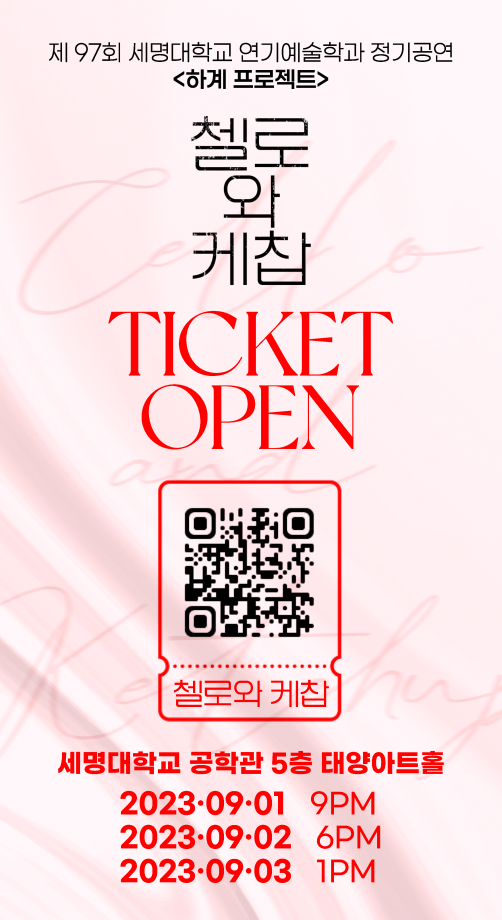 본문 시작 홈으로 커뮤니티 학과소개 입학정보 교수소개 학과과정 커뮤니티 공연예매 안내 홈페이지가이드 포토갤러리 공지사항 포토갤러리 작품DB 동아리 학사일정 학생회 포토갤러리 페이스북 트위터 프린트 제 97회 세명대학교 연기예술학과 정기공연 '하계 프로젝트' < 첼로와 케찹 > 연기예술학과 4034 2023-08-24 제 97회 세명대학교 연기예술학과 정기공연 '하계 프로젝트' < 첼로와 케찹 > 캐릭터 포스터 입니다. 𝑪𝒆𝒍𝒍𝒐 𝒂𝒏𝒅 𝑲𝒆𝒕𝒄𝒉𝒖𝒑 𝟐𝟎𝟐𝟑•𝟎𝟗•𝟎𝟏 𝟗𝐏𝐌 𝟐𝟎𝟐𝟑•𝟎𝟗•𝟎𝟐 𝟔𝐏𝐌 𝟐𝟎𝟐𝟑•𝟎𝟗•𝟎𝟑 𝟏𝐏𝐌 세명대학교 공학관 5층 태양아트홀 - 2023.08.19 - 2023.09.11 첫 번째 작품 | d0nut 두 번째 작품 | 첼로와 케찹 세 번째 작품 | 하녀들 여러분들의 많은 관심과 참여 부탁드립니다. 목록 이전사이와의 인터뷰 - 23년도 무대장 ‘장보배‘ 다음 제5회 세명진로 Festival 개최 안내 담당부서 : 연기예술학과 담당자 : - 연락처 : 043-649-1733 최종수정일 : 2024-10-26 만족도조사 만족도 조사 이 페이지에서 제공하는 정보에 대하여 만족하시나요? 매우만족 만족 보통 불만족 매우불만족