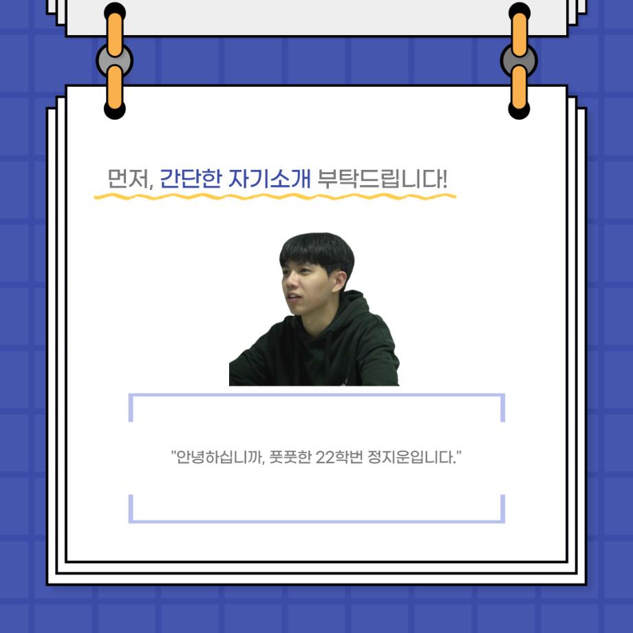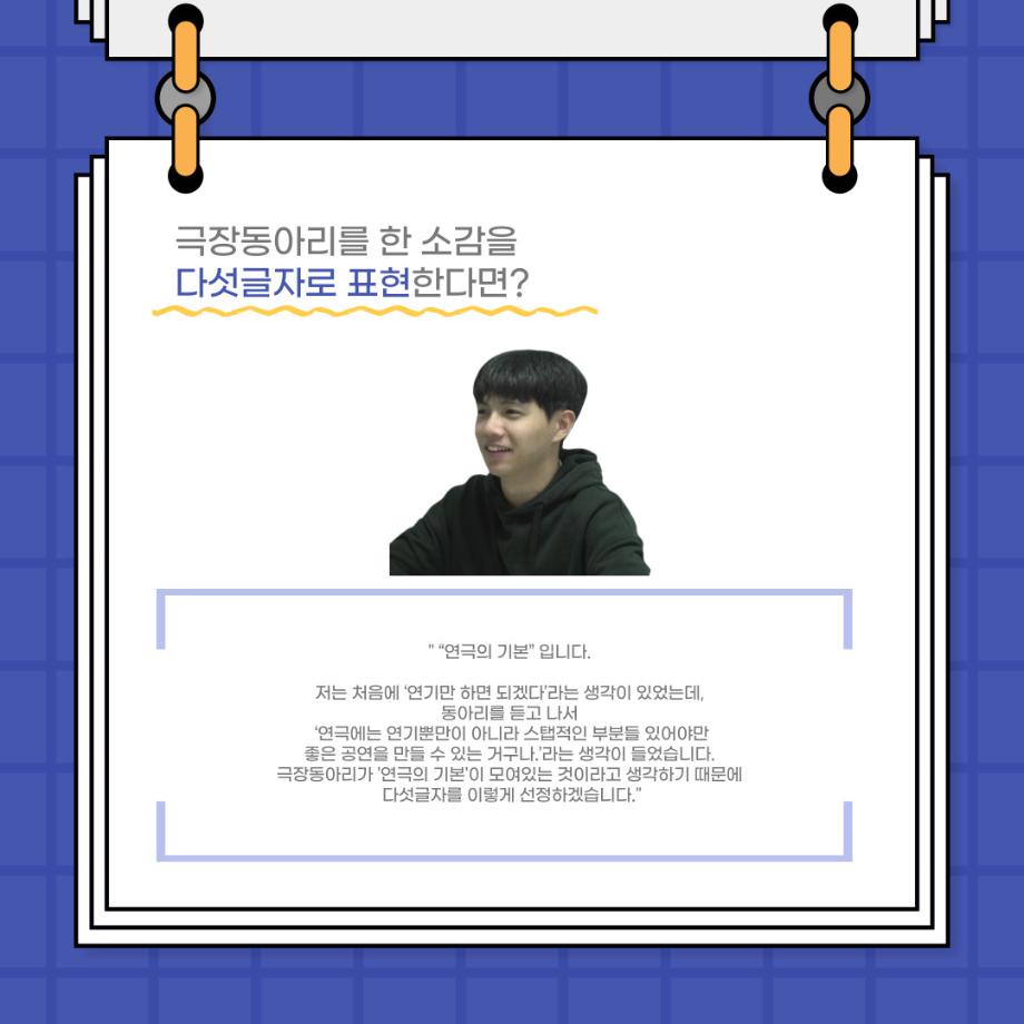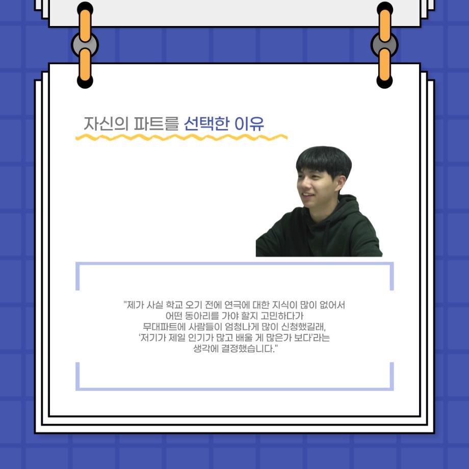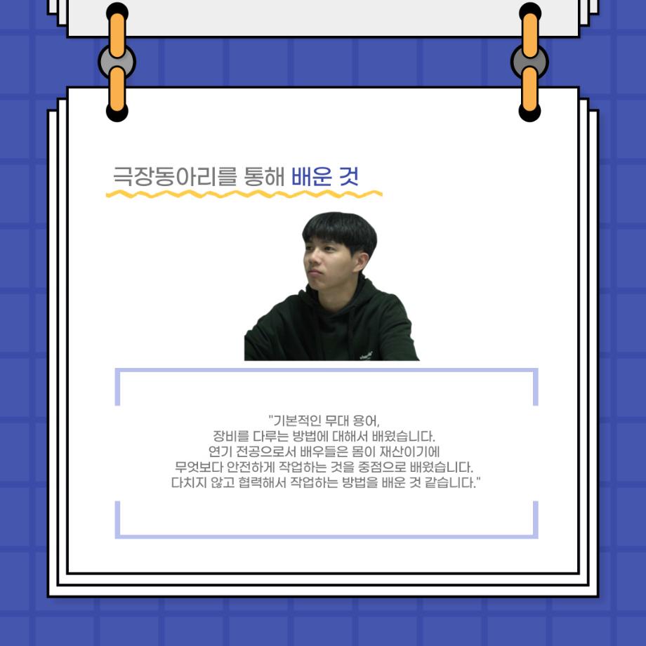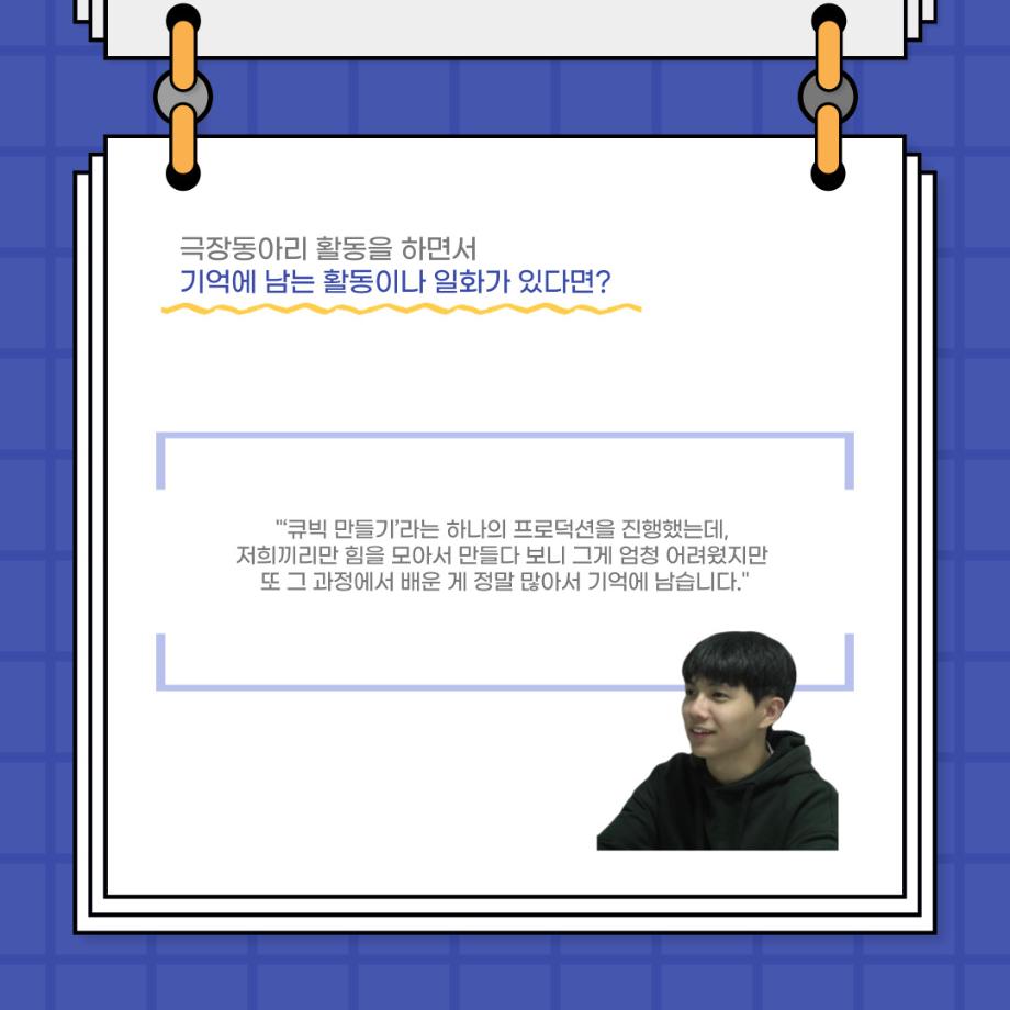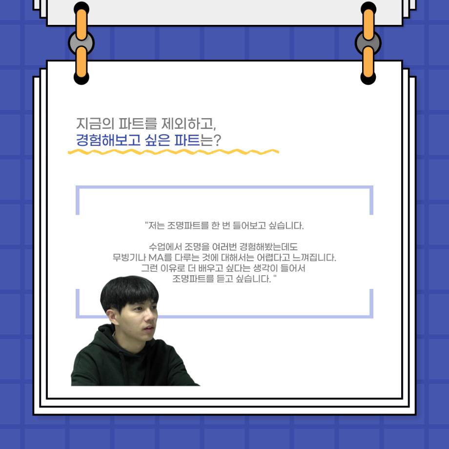 본문 시작 홈으로 커뮤니티 학과소개 입학정보 교수소개 학과과정 커뮤니티 공연예매 안내 홈페이지가이드 포토갤러리 공지사항 포토갤러리 작품DB 동아리 학사일정 학생회 포토갤러리 페이스북 트위터 프린트 사이와의 인터뷰 - 23년도 극장동아리 무대 파트 부원 ‘정지운‘ 연기예술학과 3023 2024-01-24 안녕하십니까. 23년도 학회 ‘사이’입니다. 학회 ‘사이’의 열여섯번째 인터뷰로 연기예술학과 23년도 극장동아리 무대 파트 부원인 정지운 학생과 인터뷰하는 시간을 가졌습니다. 이번 인터뷰에서는 무대파트를 선택한 이유, 극장동아리를 통해 배운 것, 동아리를 하면서 기억에 남는 활동이나 일화 등에 대해 인터뷰하였습니다. 다음 인터뷰 컨텐츠 ‘사인’도 많은 사랑 부탁드립니다. 목록 이전세명대학교 연기예술학과 종강총회 <커튼콜> 다음 사이와의 인터뷰 - 23년도 극장동아리 무대 파트 부원 ‘박상훈‘ 담당부서 : 연기예술학과 담당자 : - 연락처 : 043-649-1733 최종수정일 : 2024-10-26 만족도조사 만족도 조사 이 페이지에서 제공하는 정보에 대하여 만족하시나요? 매우만족 만족 보통 불만족 매우불만족