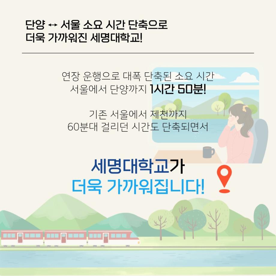 본문 시작 홈으로 커뮤니티 학과소개 입학정보 교수소개 학과과정 커뮤니티 공연예매 안내 홈페이지가이드 포토갤러리 공지사항 포토갤러리 작품DB 동아리 학사일정 학생회 포토갤러리 페이스북 트위터 프린트 더 가까워진 세명대학교 연기예술학과 2971 2024-01-29 지난 29일부터 제천, 단양을 지나는 중앙선 KTX가 서울역까지 연장 된다는 사실. 열차 또한 증차되고, 단양<->서울간 소요 시간도 단축되면서 세명대<->서울간 소요 시간도 단축됩니다. 편리한 통학과 함께 더욱 가까워진 재미있는 경험 가득한 세명대학교 로 오세요. 목록 이전세명대학교 연기예술학과 특강 [박건형 배우님] 다음 세명대학교 연기예술학과 특강 [최진영 배우님] 담당부서 : 연기예술학과 담당자 : - 연락처 : 043-649-1733 최종수정일 : 2024-10-26 만족도조사 만족도 조사 이 페이지에서 제공하는 정보에 대하여 만족하시나요? 매우만족 만족 보통 불만족 매우불만족
