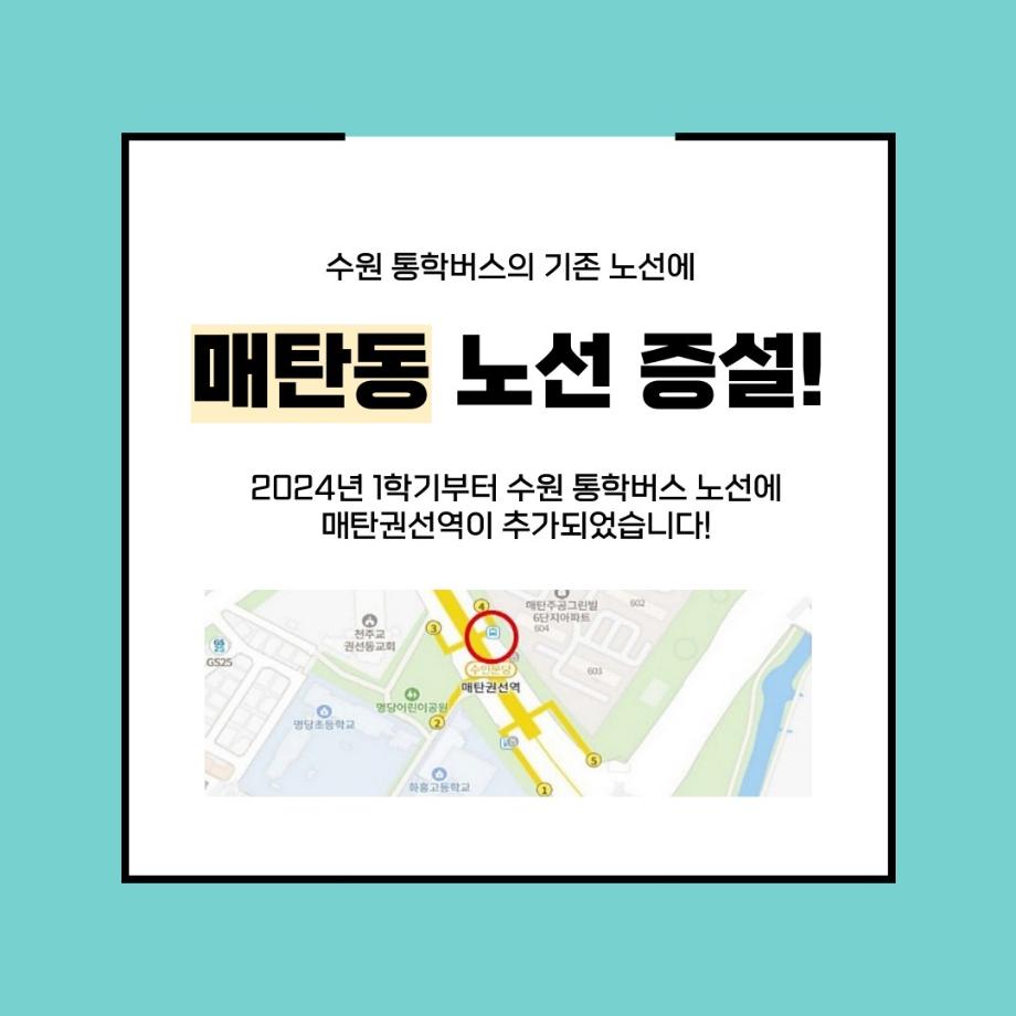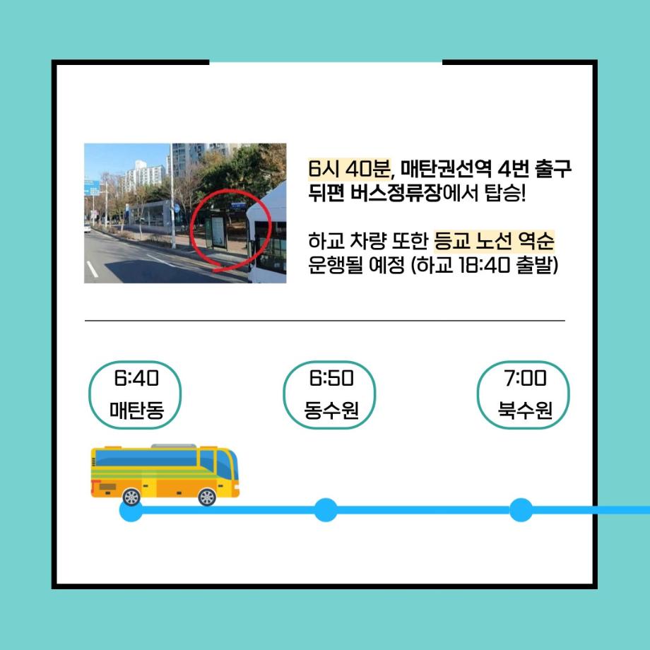 본문 시작 홈으로 커뮤니티 학과소개 입학정보 교수소개 학과과정 커뮤니티 공연예매 안내 홈페이지가이드 포토갤러리 공지사항 포토갤러리 작품DB 동아리 학사일정 학생회 포토갤러리 페이스북 트위터 프린트 세명대 통학버스, 경기 수원지역 노선 증설 연기예술학과 3316 2024-01-30 경기 수원지역 통학버스 노선에 매탄동 노선이 새롭게 증설되었습니다. 6시 40분, 매탄권선역 4번 출구 뒤편 버스정류장에서 탑승해 기존 노선(동수원, 북수원)을 지나 세명대학교까지 단숨에 하교 버스도 등고 버스 노선의 역순으로 운행된다는 사실. 더 편리해진 통학버스 타고 세명대학교로 등교하자. 목록 이전세명대학교 연기예술학과 특강 [최진영 배우님] 다음 세명대학교 연기예술학과 특강 [김낙형 연출가님] 담당부서 : 연기예술학과 담당자 : - 연락처 : 043-649-1733 최종수정일 : 2024-10-26 만족도조사 만족도 조사 이 페이지에서 제공하는 정보에 대하여 만족하시나요? 매우만족 만족 보통 불만족 매우불만족