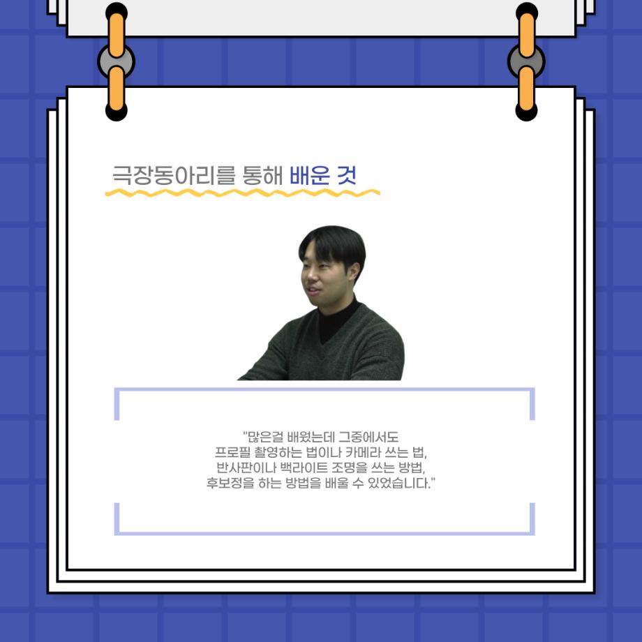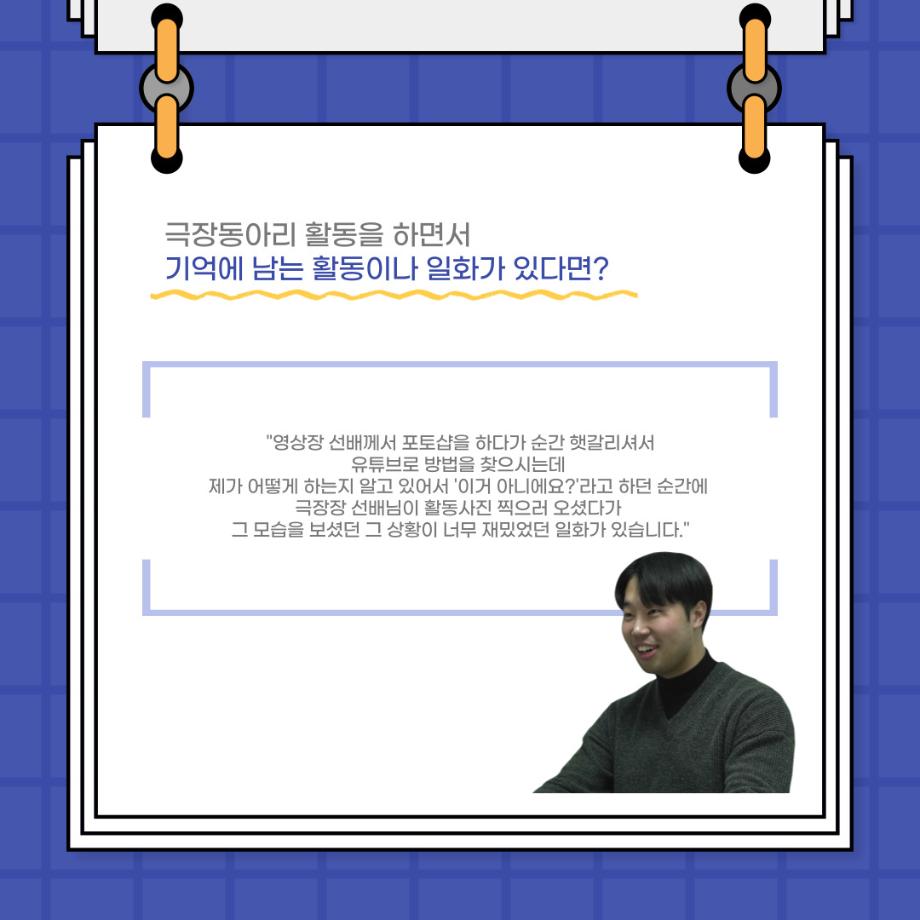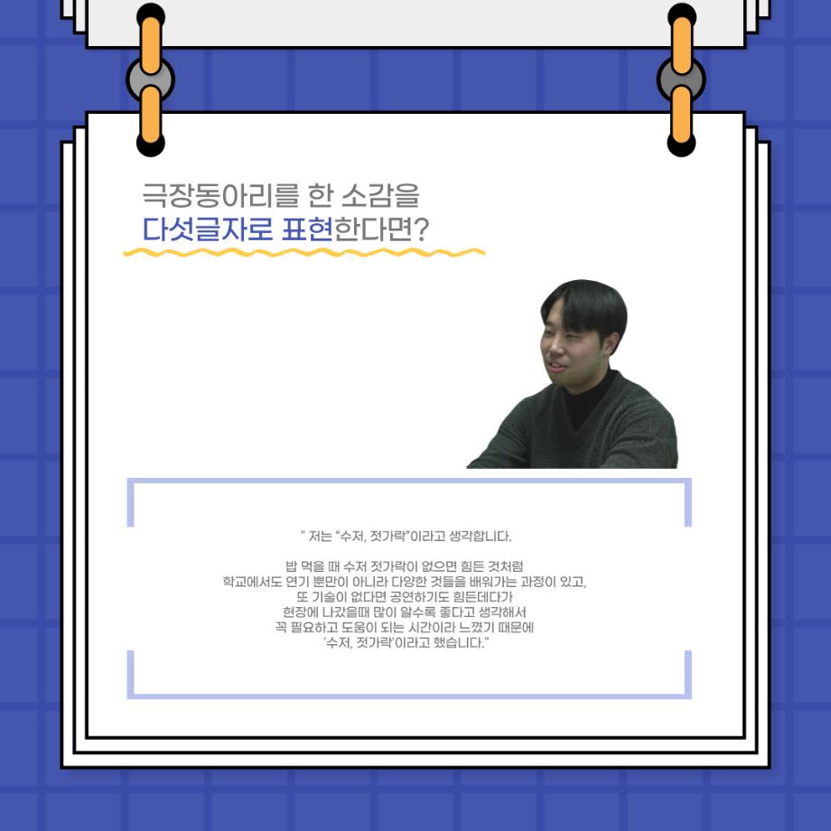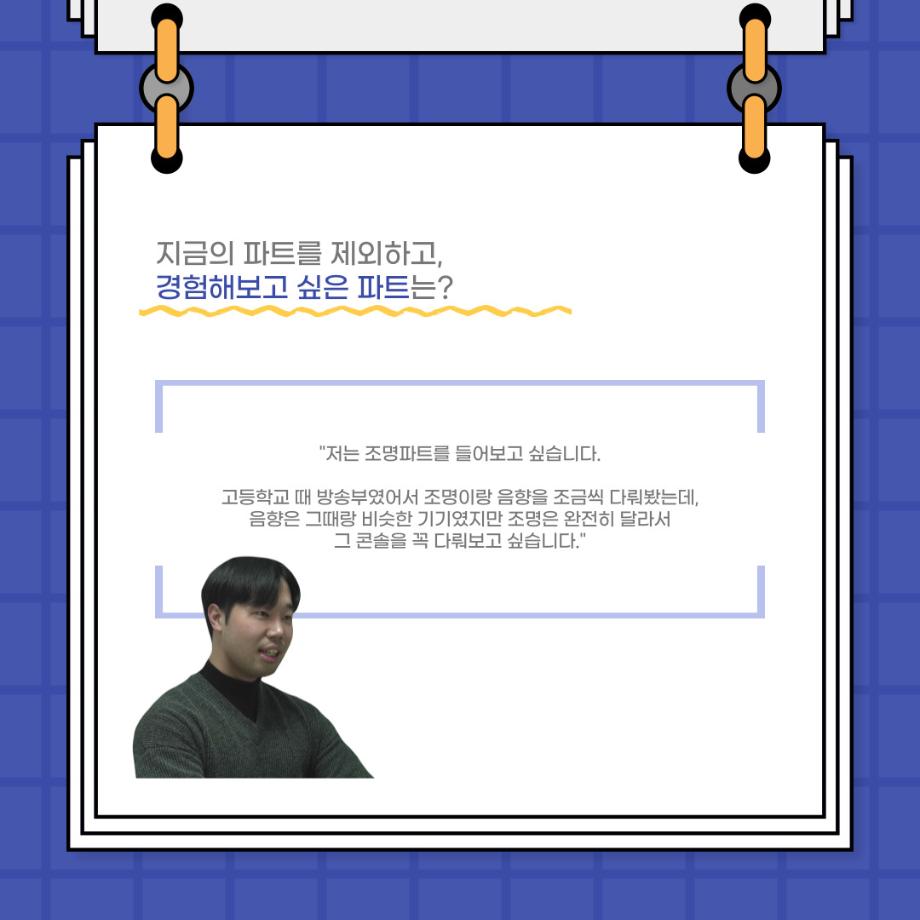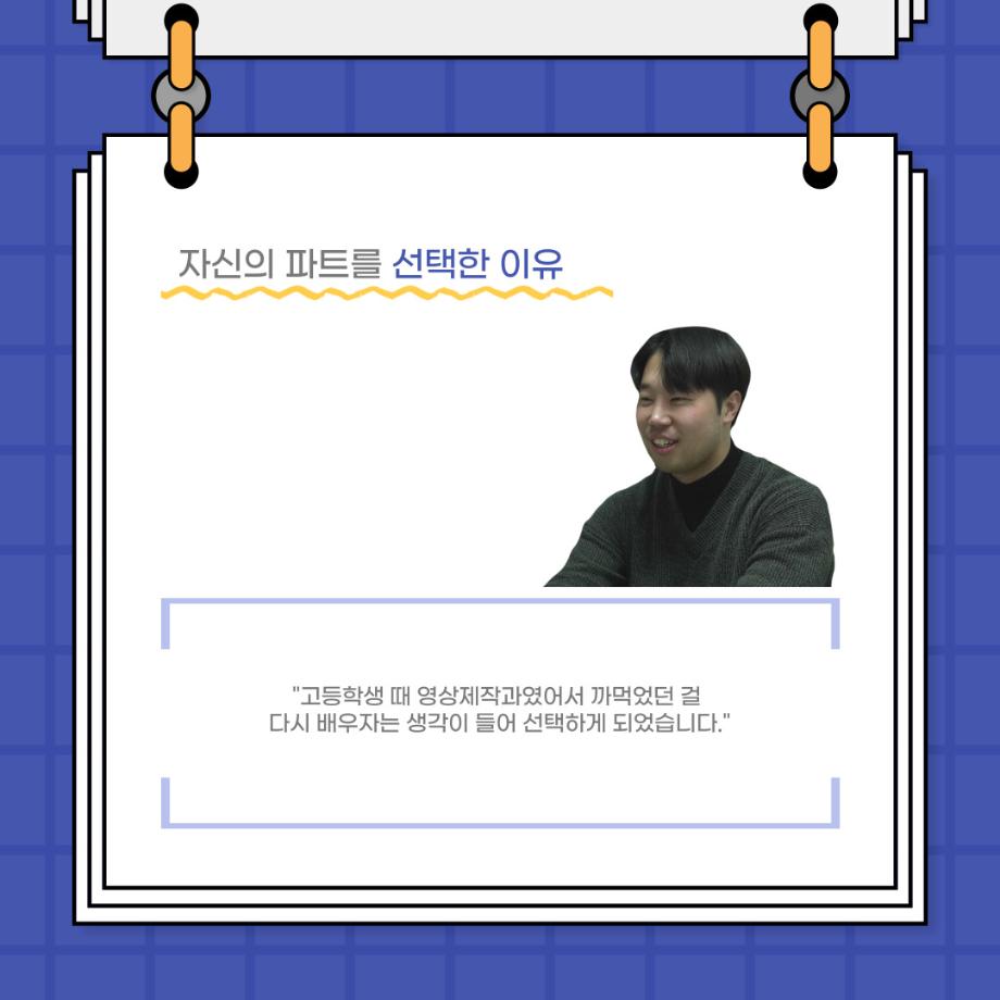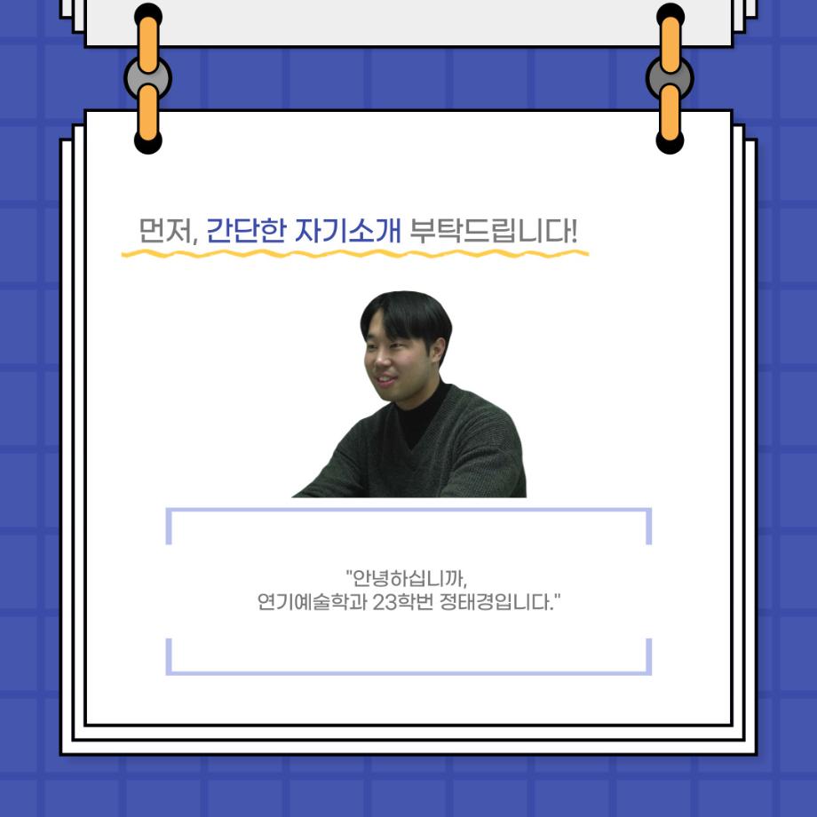 본문 시작 홈으로 커뮤니티 학과소개 입학정보 교수소개 학과과정 커뮤니티 공연예매 안내 홈페이지가이드 포토갤러리 공지사항 포토갤러리 작품DB 동아리 학사일정 학생회 포토갤러리 페이스북 트위터 프린트 사이와의 인터뷰 - 23년도 극장동아리 영상 파트 부원 ‘정태경‘ 연기예술학과 3006 2024-02-02 안녕하십니까. 23년도 학회 ‘사이’입니다. 학회 ‘사이’의 열아홉번째 인터뷰로 연기예술학과 23년도 극장동아리 영상 파트 부원인 정태경 학생과 인터뷰하는 시간을 가졌습니다. 이번 인터뷰에서는 영상파트를 선택한 이유, 극장동아리를 통해 배운 것, 동아리를 하면서 기억에 남는 활동이나 일화 등에 대해 인터뷰하였습니다. 다음 인터뷰 컨텐츠 ‘사인’도 많은 사랑 부탁드립니다. 목록 이전세명대학교 연기예술학과 특강 [김지인 캐스팅 디렉터님] 다음 사이와의 인터뷰 - 23년도 졸업작품 학생연출 ‘박찬우‘ 담당부서 : 연기예술학과 담당자 : - 연락처 : 043-649-1733 최종수정일 : 2024-10-26 만족도조사 만족도 조사 이 페이지에서 제공하는 정보에 대하여 만족하시나요? 매우만족 만족 보통 불만족 매우불만족