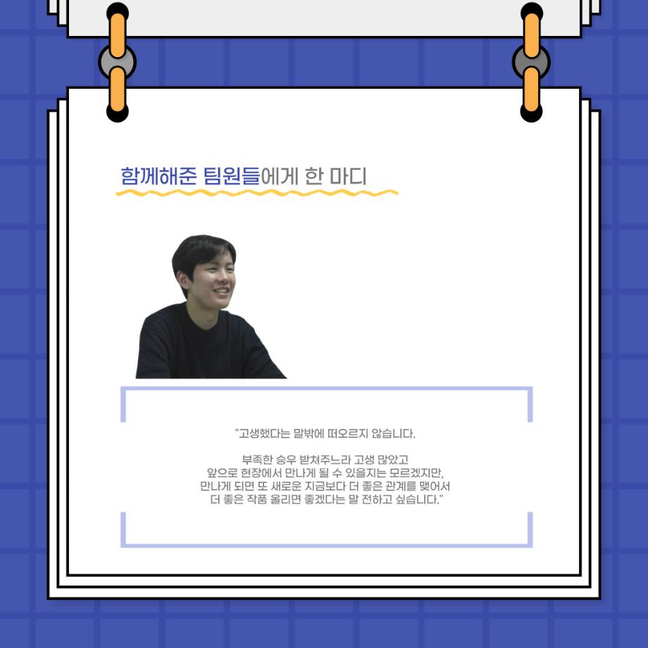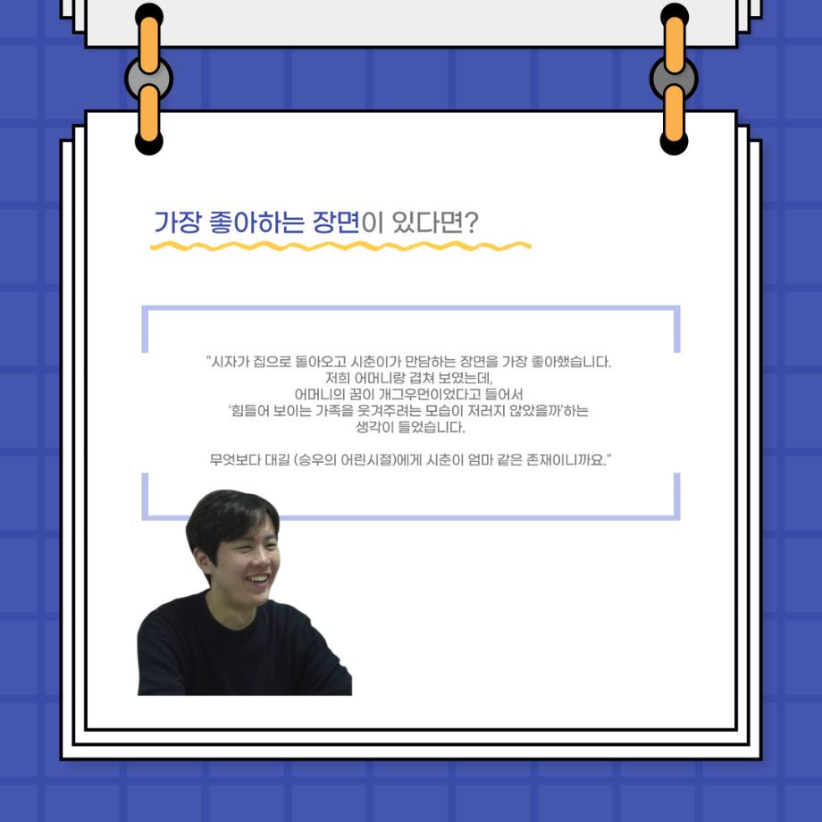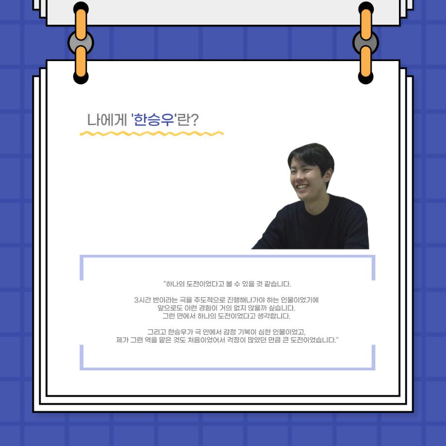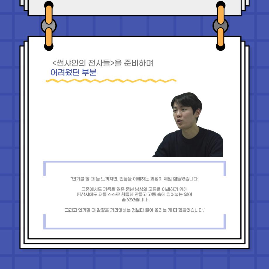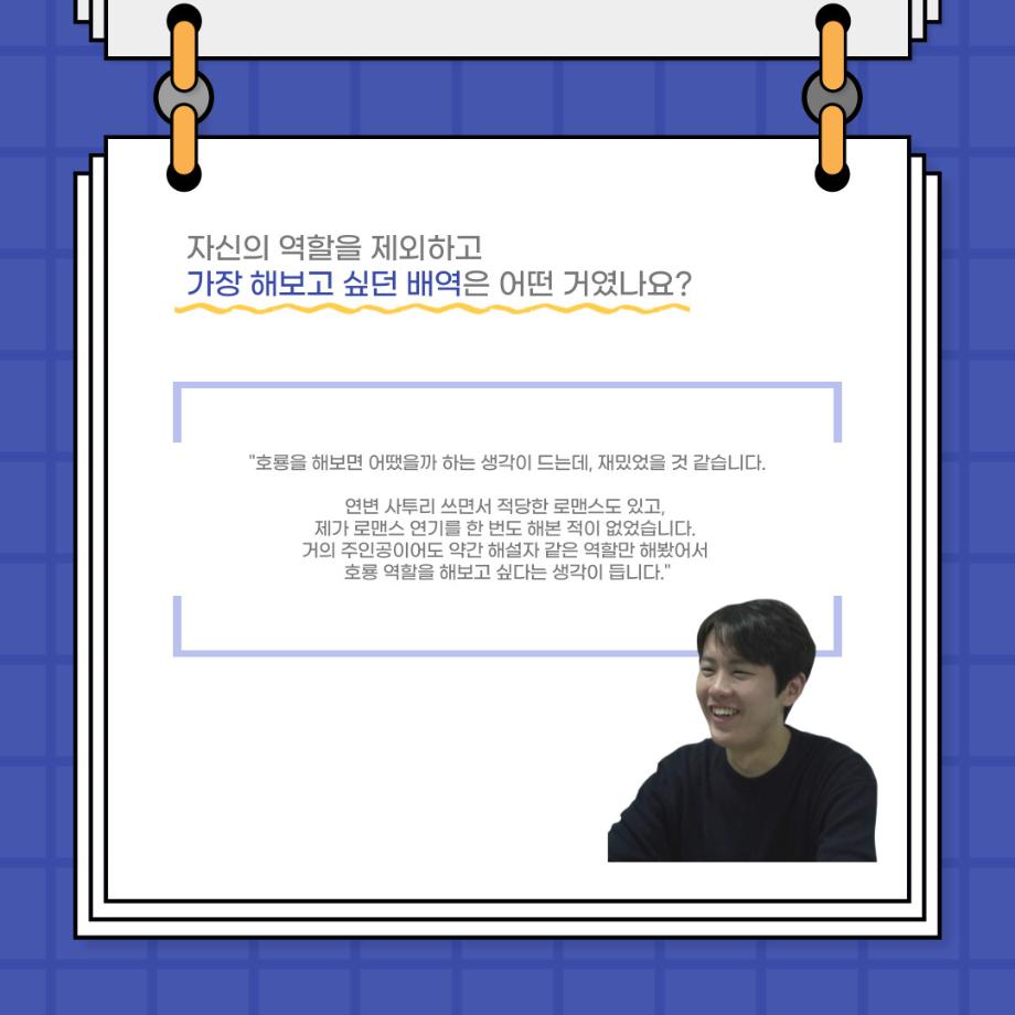 본문 시작 홈으로 커뮤니티 학과소개 입학정보 교수소개 학과과정 커뮤니티 공연예매 안내 홈페이지가이드 포토갤러리 공지사항 포토갤러리 작품DB 동아리 학사일정 학생회 포토갤러리 페이스북 트위터 프린트 사이와의 인터뷰 - 23년도 졸업작품 한승우役 ‘김덕종‘ 연기예술학과 3124 2024-02-06 안녕하십니까. 23년도 학회 ‘사이’입니다. 학회 ‘사이’의 스물한 번째 인터뷰로 연기예술학과 23년도 졸업작품 <썬샤인의 전사들>의 한승우 역인 김덕종 학생과 인터뷰하는 시간을 가졌습니다. 이번 인터뷰에서는 졸업작품 <썬샤인의 전사들>를 준비하면서 어려웠던 부분, 가장 좋아하는 장면, 가장 해보고 싶었던 배역 등에 대해 인터뷰하였습니다. 다음 인터뷰 컨텐츠 ‘사인’도 많은 사랑 부탁드립니다. 목록 이전사이와의 인터뷰 - 23년도 졸업작품 학생연출 ‘박찬우‘ 다음 사이와의 인터뷰 - 23년도 졸업작품 송시춘役 ‘홍민주‘ 담당부서 : 연기예술학과 담당자 : - 연락처 : 043-649-1733 최종수정일 : 2024-10-26 만족도조사 만족도 조사 이 페이지에서 제공하는 정보에 대하여 만족하시나요? 매우만족 만족 보통 불만족 매우불만족