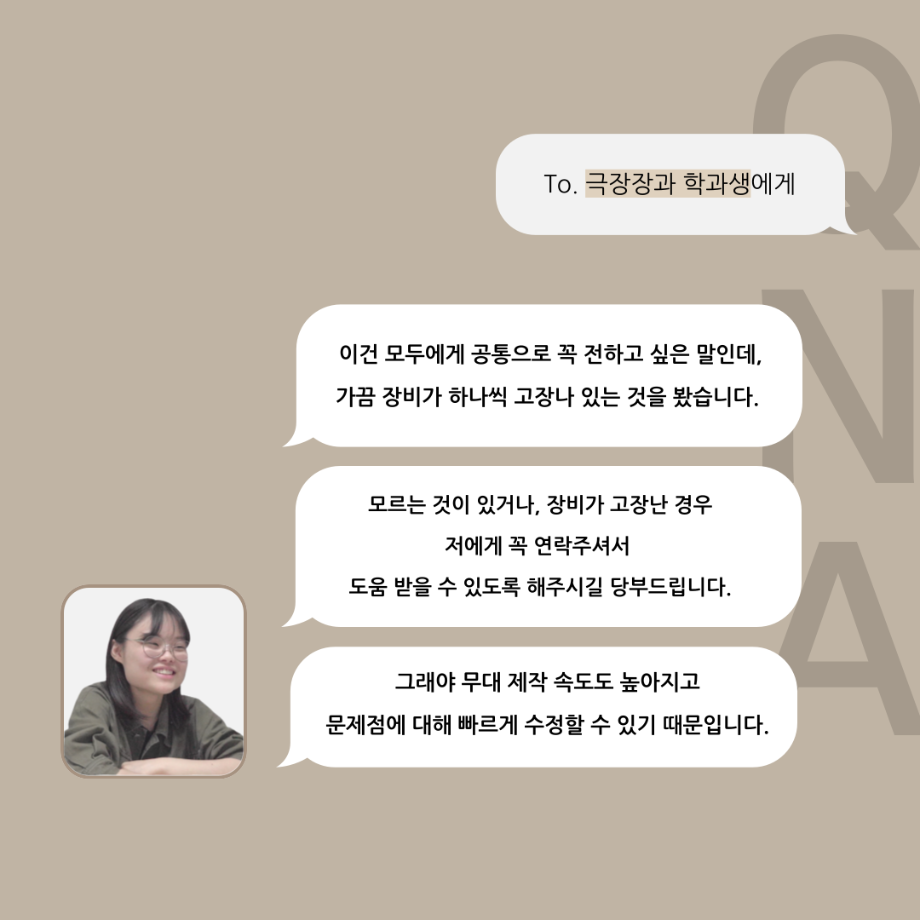 본문 시작 홈으로 커뮤니티 학과소개 입학정보 교수소개 학과과정 커뮤니티 공연예매 안내 홈페이지가이드 포토갤러리 공지사항 포토갤러리 작품DB 동아리 학사일정 학생회 포토갤러리 페이스북 트위터 프린트 '품'위있는 인'터뷰' - 24년도 무대장 <장보배> 연기예술학과 3290 2024-07-16 안녕하십니까. 24년도 학회 ‘품‘ 입니다. 학회 ‘품’의 네 번째 인터뷰로 세명대학교 연기예술학과 24학년도 무대장인 장보배 학우와 인터뷰 하는 시간을 가졌습니다. 무대장을 맡게된 소감과 무대는 어떤 의미가 있는지, 위험한 장비는 무엇이며 극장장과 학과생에게 전하고 싶은 말 등을 질문하는 시간을 가졌습니다. 앞으로 있을 인터뷰 컨텐츠인 ‘품터뷰’ 많은 사랑 부탁드립니다. 목록 이전제5회 대한민국 신직업·미래직업 아이디어 공모전 다음 2024학년도 2학기 표준현장실습 학생신청 안내 담당부서 : 연기예술학과 담당자 : - 연락처 : 043-649-1733 최종수정일 : 2024-10-26 만족도조사 만족도 조사 이 페이지에서 제공하는 정보에 대하여 만족하시나요? 매우만족 만족 보통 불만족 매우불만족