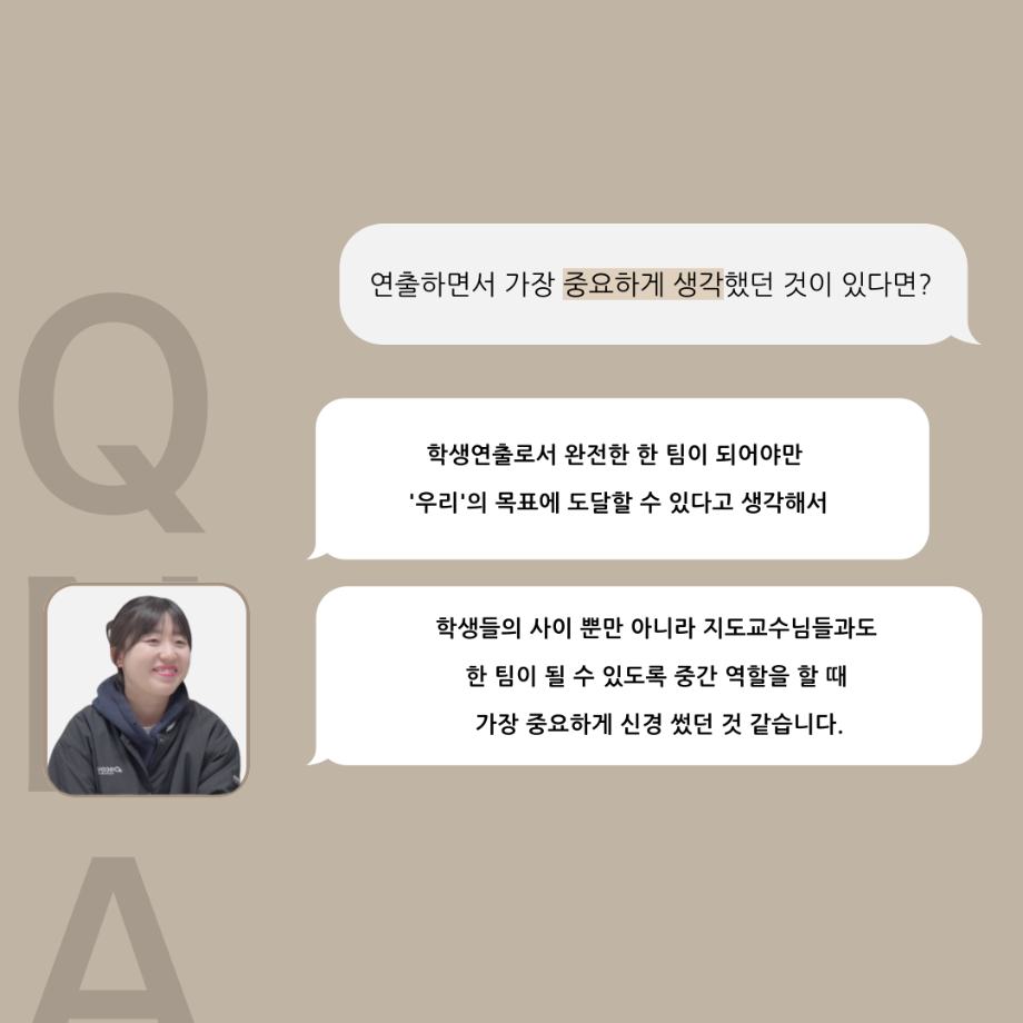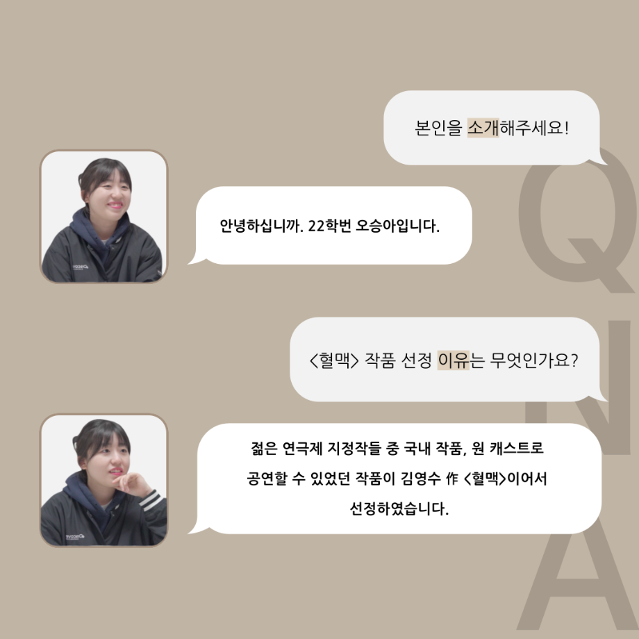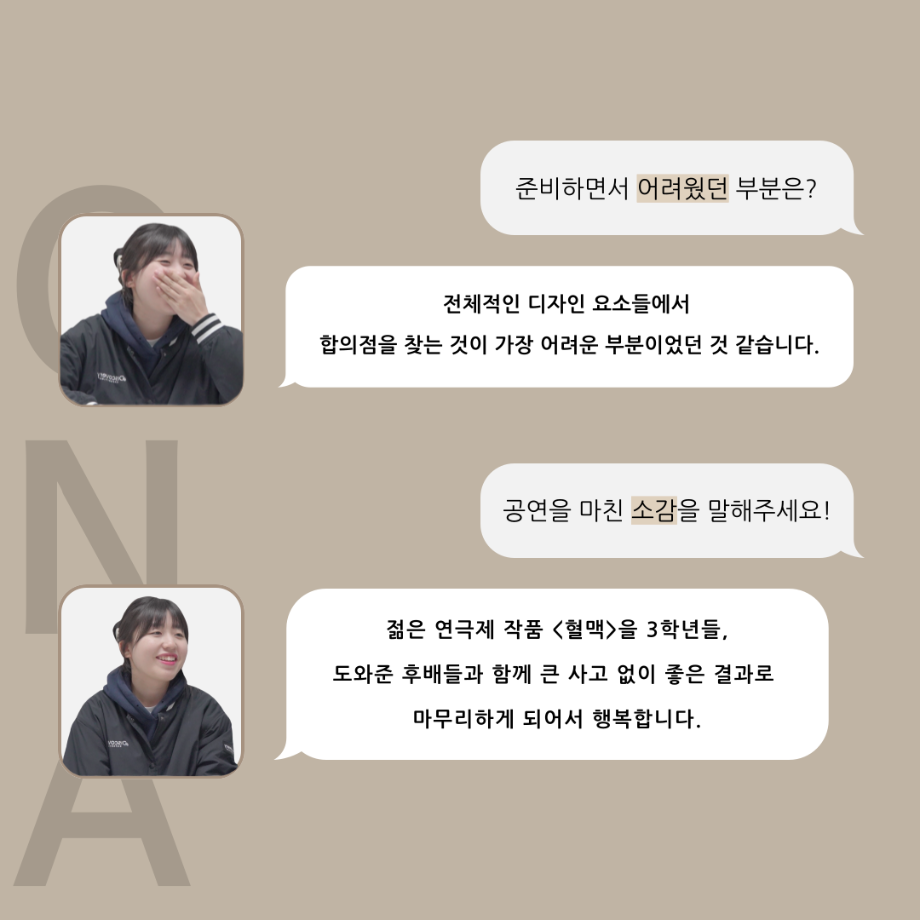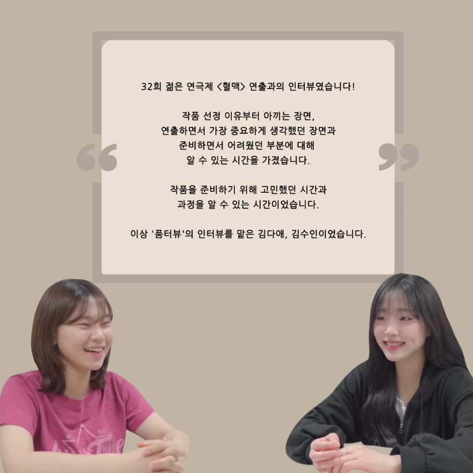 본문 시작 홈으로 커뮤니티 학과소개 입학정보 교수소개 학과과정 커뮤니티 공연예매 안내 홈페이지가이드 포토갤러리 공지사항 포토갤러리 작품DB 동아리 학사일정 학생회 포토갤러리 페이스북 트위터 프린트 '품'위있는 인'터뷰' - 24년도 젊은연극제 학생 연출 <오승아> 연기예술학과 3314 2024-08-07 안녕하십니까. 24년도 학회 ‘품’ 입니다. 학회 ‘품’의 열번째 인터뷰로 세명대학교 연기예술학과 24학년도 젊은연극제 참가작 <혈맥>의 학생 연출 오승아 학우와 인터뷰 하는 시간을 가졌습니다. 작품 선정 이유부터 아끼는 장면, 연출하면서 가장 중요하게 생각했던 장면과 작품을 준비하면서 어려웠던 부분에 대해 알 수 있는 시간을 가졌습니다. 앞으로 있을 인터뷰 컨텐츠인 ‘품터뷰’ 많은 사랑 부탁드립니다. 목록 다음 2024학년도 진로플러스업 캠프 참여자 모집 다음 ‘품’위있는 인‘터뷰’ - 24년도 젊은연극제 원팔役 <박성민> 담당부서 : 연기예술학과 담당자 : - 연락처 : 043-649-1733 최종수정일 : 2024-10-26 만족도조사 만족도 조사 이 페이지에서 제공하는 정보에 대하여 만족하시나요? 매우만족 만족 보통 불만족 매우불만족