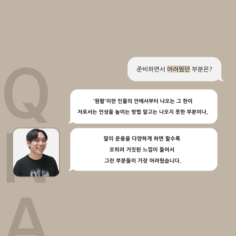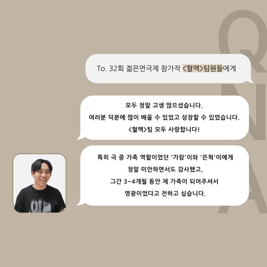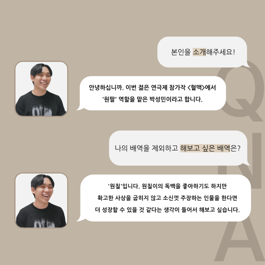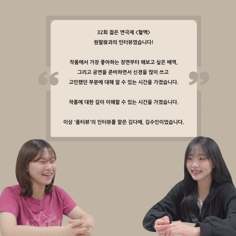본문 시작 홈으로 커뮤니티 학과소개 입학정보 교수소개 학과과정 커뮤니티 공연예매 안내 홈페이지가이드 포토갤러리 공지사항 포토갤러리 작품DB 동아리 학사일정 학생회 포토갤러리 페이스북 트위터 프린트 ‘품’위있는 인‘터뷰’ - 24년도 젊은연극제 원팔役 <박성민> 연기예술학과 3379 2024-08-09 안녕하십니까. 24년도 학회 ‘품’ 입니다. 학회 ‘품’의 열 한 번째 인터뷰로 세명대학교 연기예술학과 24학년도 젊은연극제 참가작 <혈맥> 원팔 역인 박성민 학우와 인터뷰 하는 시간을 가졌습니다. 가장 좋아하는 장면, 자신의 배역을 제외하고 해보고 싶은 배역 그리고 준비하면서 어려웠던 부분과 공연을 마친 소감 등에 대해 인터뷰 하는 시간을 가졌습니다. 앞으로 있을 인터뷰 컨텐츠인 ‘품터뷰’ 많은 사랑 부탁드립니다. 목록 이전'품'위있는 인'터뷰' - 24년도 젊은연극제 학생 연출 <오승아> 다음 제6회 세명진로 Festival 대면 특강 안내 담당부서 : 연기예술학과 담당자 : - 연락처 : 043-649-1733 최종수정일 : 2024-10-26 만족도조사 만족도 조사 이 페이지에서 제공하는 정보에 대하여 만족하시나요? 매우만족 만족 보통 불만족 매우불만족