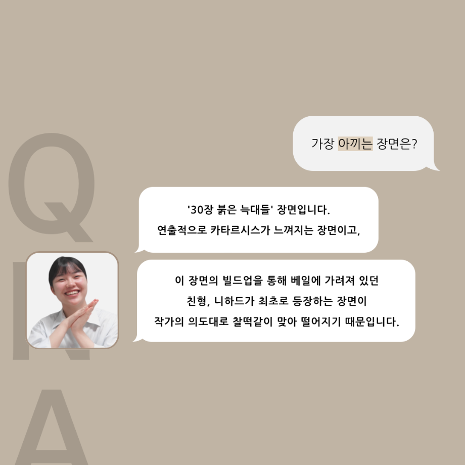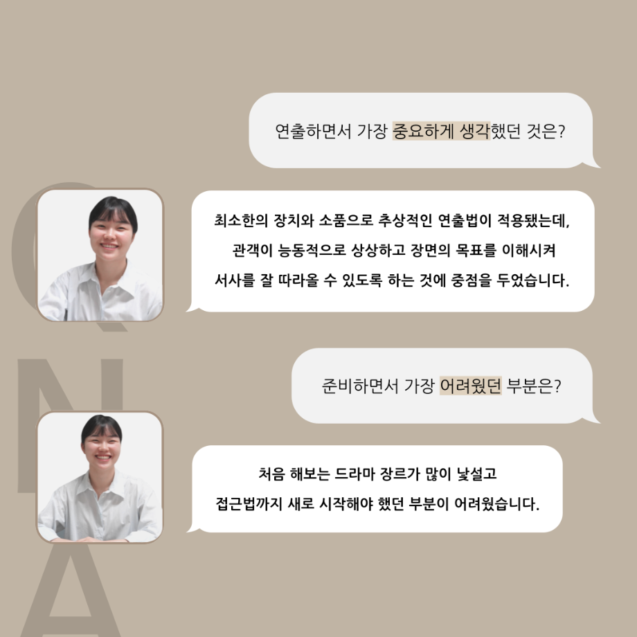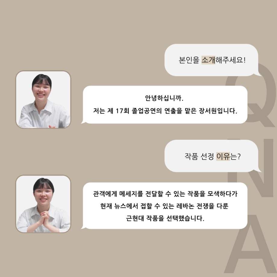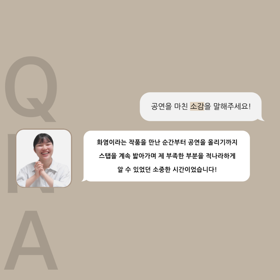 본문 시작 홈으로 커뮤니티 학과소개 입학정보 교수소개 학과과정 커뮤니티 공연예매 안내 홈페이지가이드 포토갤러리 공지사항 포토갤러리 작품DB 동아리 학사일정 학생회 포토갤러리 페이스북 트위터 프린트 ‘품’위있는 인‘터뷰’ - 24년도 졸업작품 학생 연출 <장서원> 연기예술학과 3023 2024-12-04 안녕하십니까. 24년도 학회 ‘품’ 입니다. 학회 ‘품’의 열 여섯 번째 인터뷰로 세명대학교 연기예술학과 제 17회 졸업작품 <화염>의 학생 연출 장서원 학우와 인터뷰 하는 시간을 가졌습니다. 작품 선정 이유부터 아끼는 장면, 연출하면서 가장 중요하게 생각했던 장면과 작품을 준비하면서 어려웠던 부분에 대해 알 수 있는 시간을 가졌습니다. 앞으로 있을 인터뷰 컨텐츠인 ‘품터뷰’ 많은 사랑 부탁드립니다. 목록 이전제 111회 세명대학교 연기예술학과 뮤지컬제작실습 <All Shook Up> 스케줄표 다음 [24학번 1학년 대상] 비전 프로젝트 경험 교육_비전 포트폴리오 작성 안내 담당부서 : 연기예술학과 담당자 : - 연락처 : 043-649-1733 최종수정일 : 2024-10-26 만족도조사 만족도 조사 이 페이지에서 제공하는 정보에 대하여 만족하시나요? 매우만족 만족 보통 불만족 매우불만족