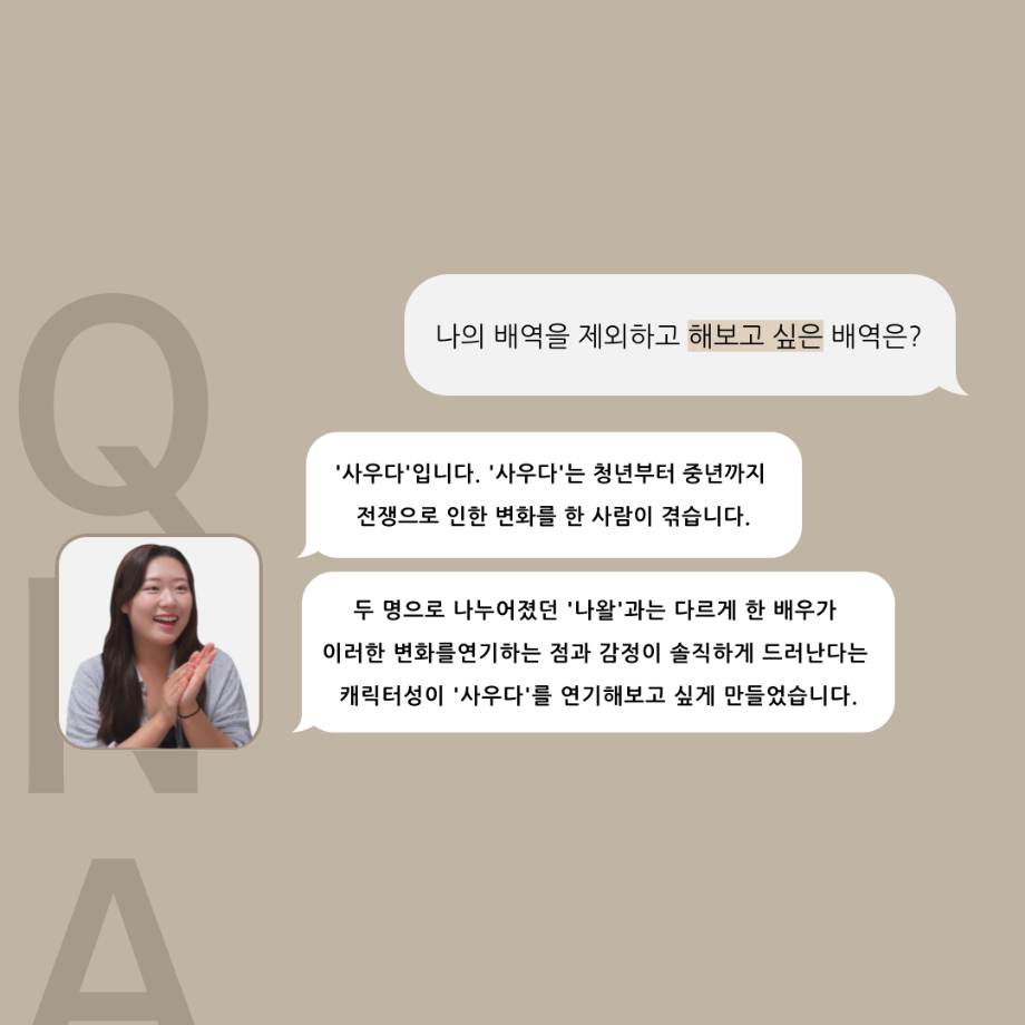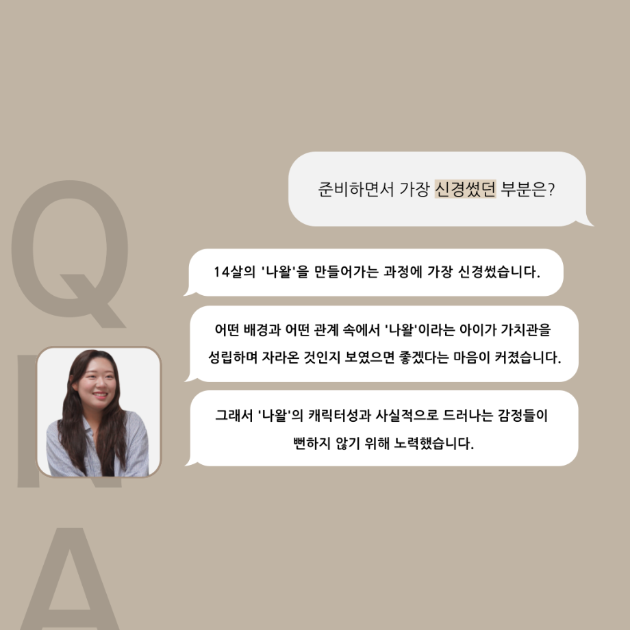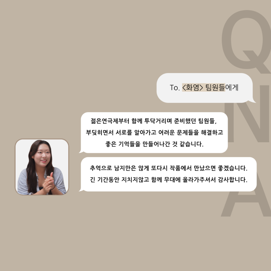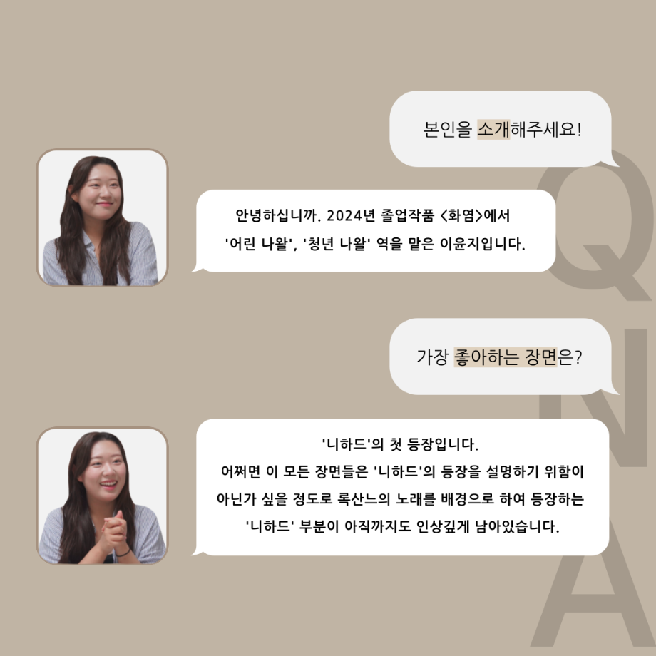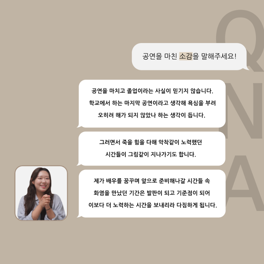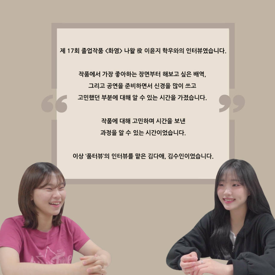 본문 시작 홈으로 커뮤니티 학과소개 입학정보 교수소개 학과과정 커뮤니티 공연예매 안내 홈페이지가이드 포토갤러리 공지사항 포토갤러리 작품DB 동아리 학사일정 학생회 포토갤러리 페이스북 트위터 프린트 ‘품’위있는 인‘터뷰’ - 24년도 졸업작품 어린나왈 役 <이윤지> 연기예술학과 3234 2024-12-19 안녕하십니까. 24년도 학회 ‘품’ 입니다. 학회 ‘품’의 열 일곱 번째 인터뷰로 세명대학교 연기예술학과 제 17회 졸업작품 <화염>의 어린 나왈 역인 이윤지 학우와 인터뷰 하는 시간을 가졌습니다. 가장 좋아하는 장면, 자신의 배역을 제외하고 해보고 싶은 배역 그리고 준비하면서 어려웠던 부분과 공연을 마친 소감 등에 대해 인터뷰 하는 시간을 가졌습니다. 앞으로 있을 인터뷰 컨텐츠인 ‘품터뷰’ 많은 사랑 부탁드립니다. 목록 이전세명대학교 연기예술학과 종강총회 다음 ‘품’위있는 인‘터뷰’ - 24년도 졸업작품 르벨 役 <정성주> 담당부서 : 연기예술학과 담당자 : - 연락처 : 043-649-1733 최종수정일 : 2024-10-26 만족도조사 만족도 조사 이 페이지에서 제공하는 정보에 대하여 만족하시나요? 매우만족 만족 보통 불만족 매우불만족