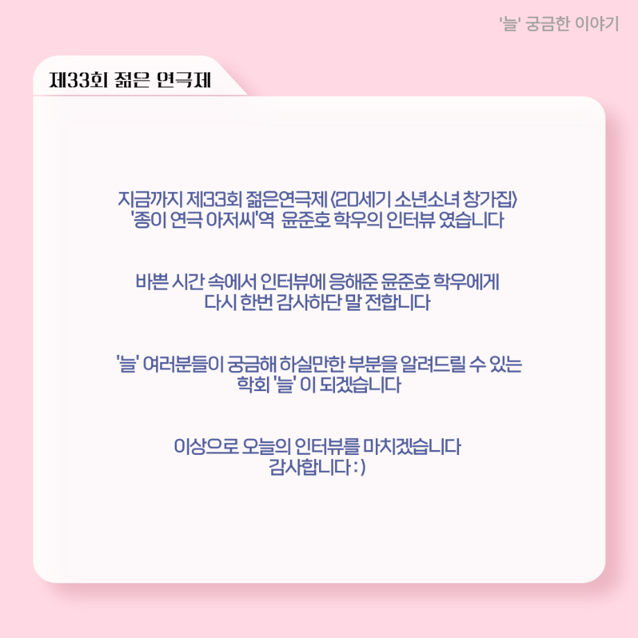 본문 시작 홈으로 커뮤니티 학과소개 입학정보 교수소개 학과과정 커뮤니티 공연예매 안내 홈페이지가이드 포토갤러리 공지사항 포토갤러리 작품DB 동아리 학사일정 학생회 포토갤러리 페이스북 트위터 프린트 ‘늘‘ 궁금한 이야기 - 젊은연극제 ‘20세기 소년소녀 창가집’ 종이연극 아저씨 役 < 윤준호 > 연기예술학과 1413 2025-08-28 . 목록 이전‘늘‘ 궁금한 이야기 - 젊은연극제 ‘20세기 소년소녀 창가집’ 사이토 役 < 박신현 > 다음 ‘늘‘ 궁금한 이야기 - 젊은연극제 ‘20세기 소년소녀 창가집’ 다큐pd 役 < 임재완 > 담당부서 : 연기예술학과 담당자 : - 연락처 : 043-649-1733 최종수정일 : 2024-10-26 만족도조사 만족도 조사 이 페이지에서 제공하는 정보에 대하여 만족하시나요? 매우만족 만족 보통 불만족 매우불만족