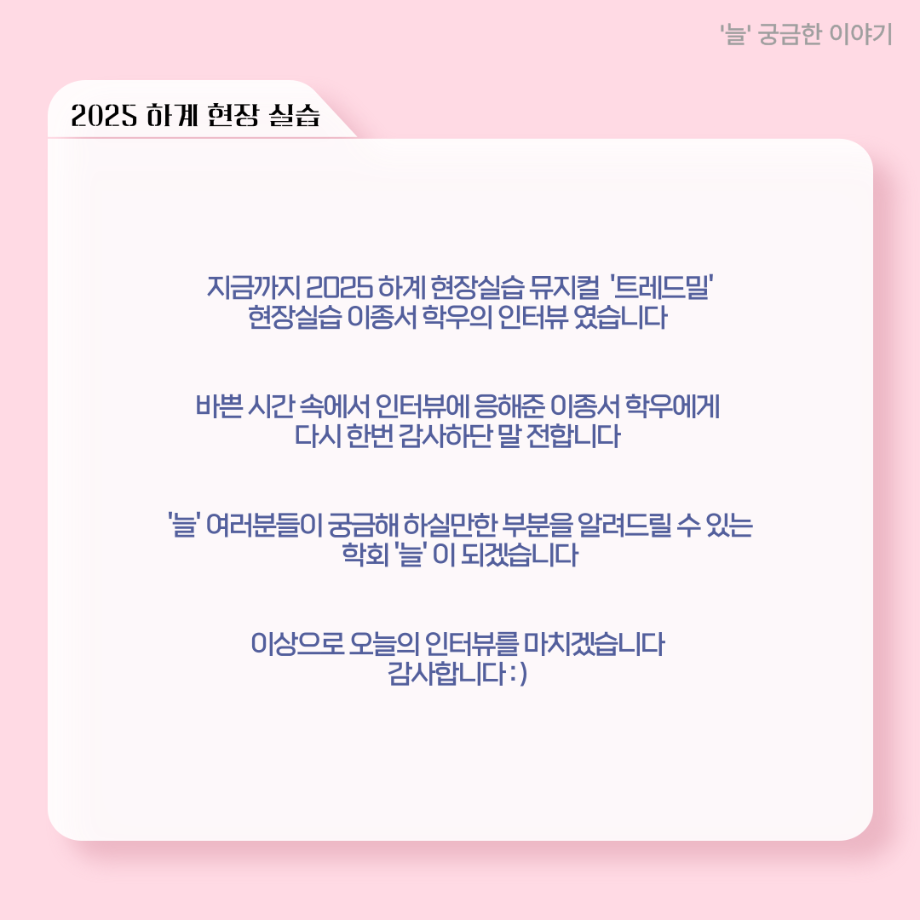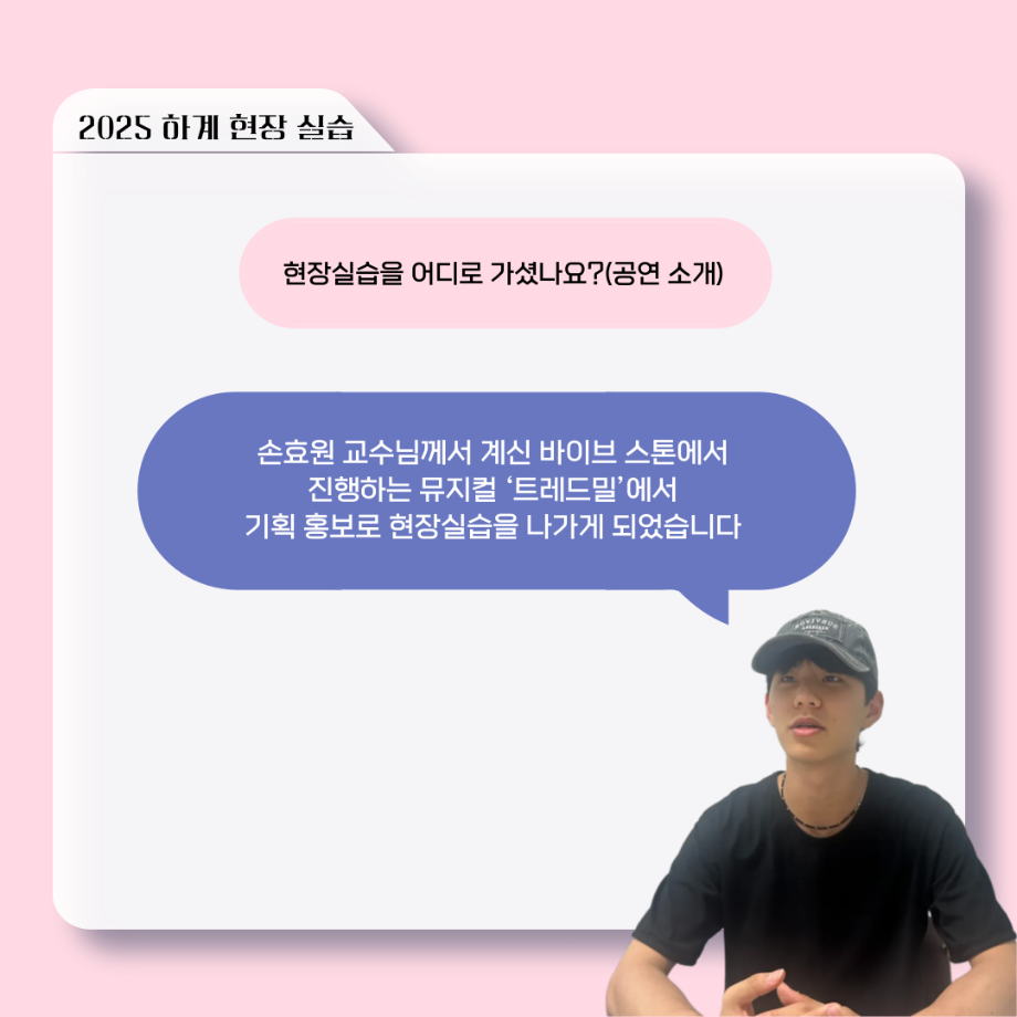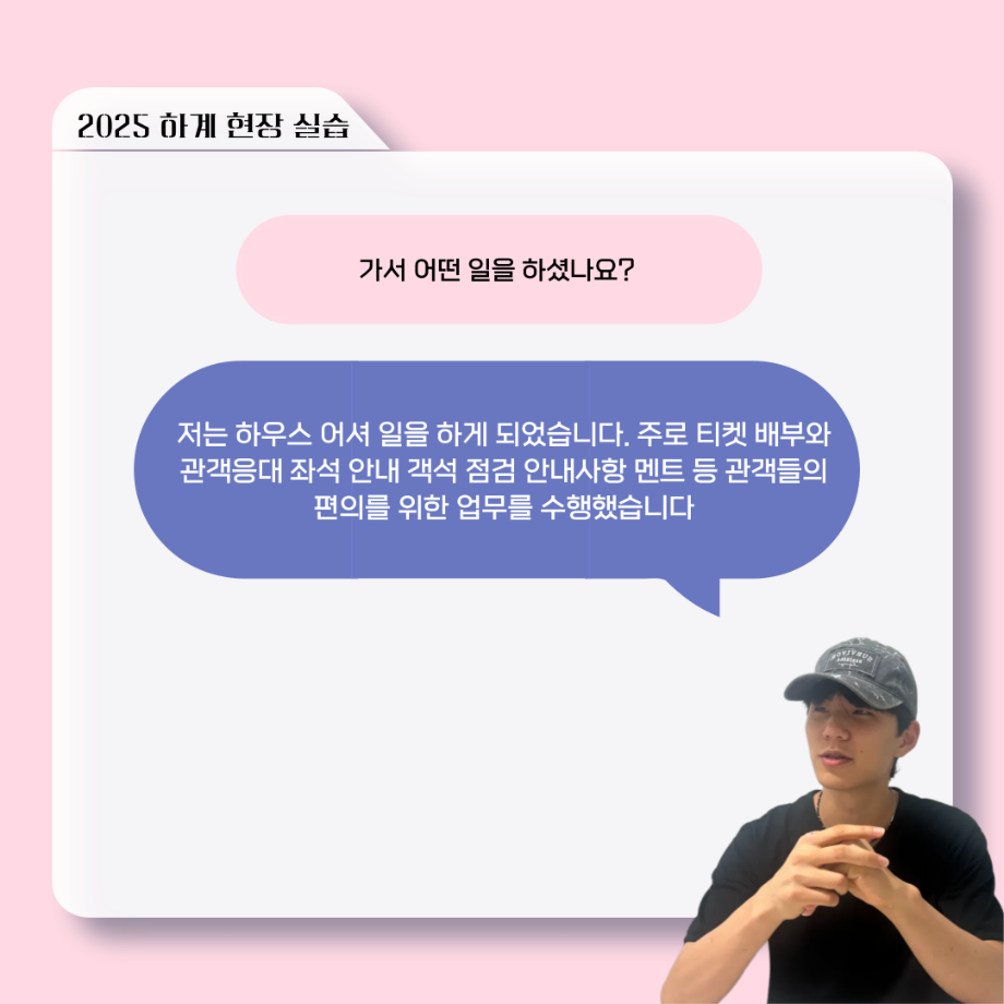 본문 시작 홈으로 커뮤니티 학과소개 입학정보 교수소개 학과과정 커뮤니티 공연예매 안내 홈페이지가이드 포토갤러리 공지사항 포토갤러리 작품DB 동아리 학사일정 학생회 포토갤러리 페이스북 트위터 프린트 ‘늘‘ 궁금한 이야기 - 현장실습 < 이종서 > 연기예술학과 1377 2025-09-17 . 목록 이전‘늘‘ 궁금한 이야기 - 젊은연극제 ‘20세기 소년소녀 창가집’ 다큐pd 役 < 임재완 > 이전117회 세명대학교 연기예술학과 하계프로젝트 사랑의온도 작품소개 담당부서 : 연기예술학과 담당자 : - 연락처 : 043-649-1733 최종수정일 : 2024-10-26 만족도조사 만족도 조사 이 페이지에서 제공하는 정보에 대하여 만족하시나요? 매우만족 만족 보통 불만족 매우불만족