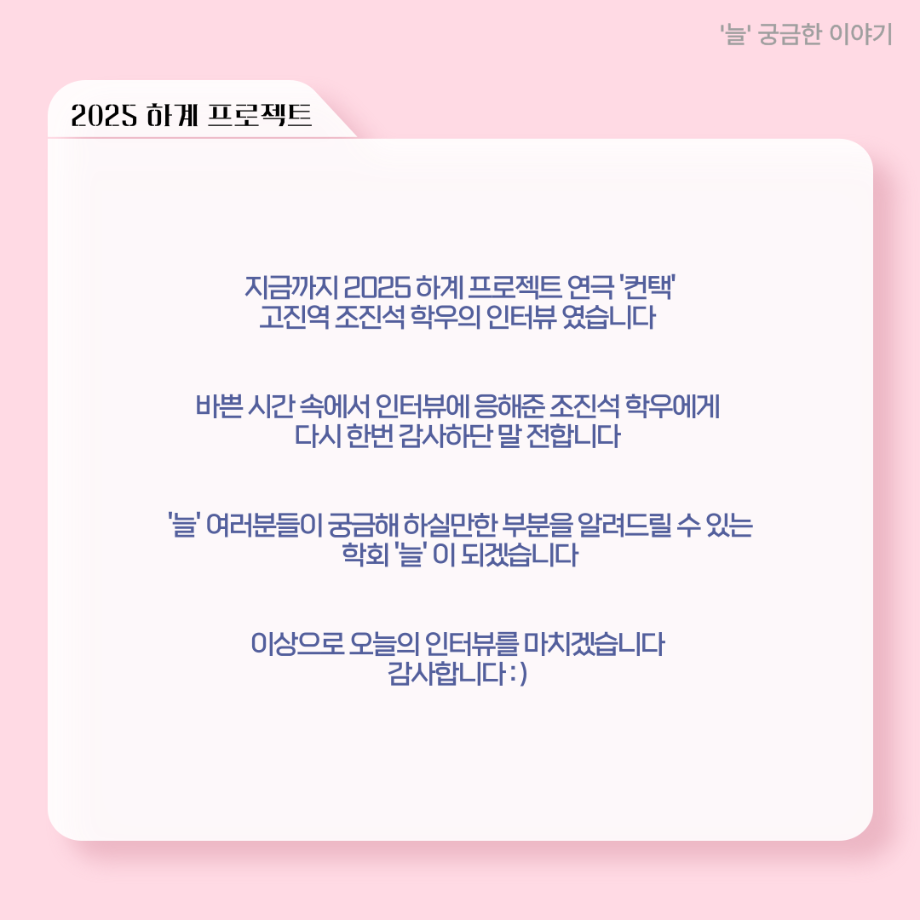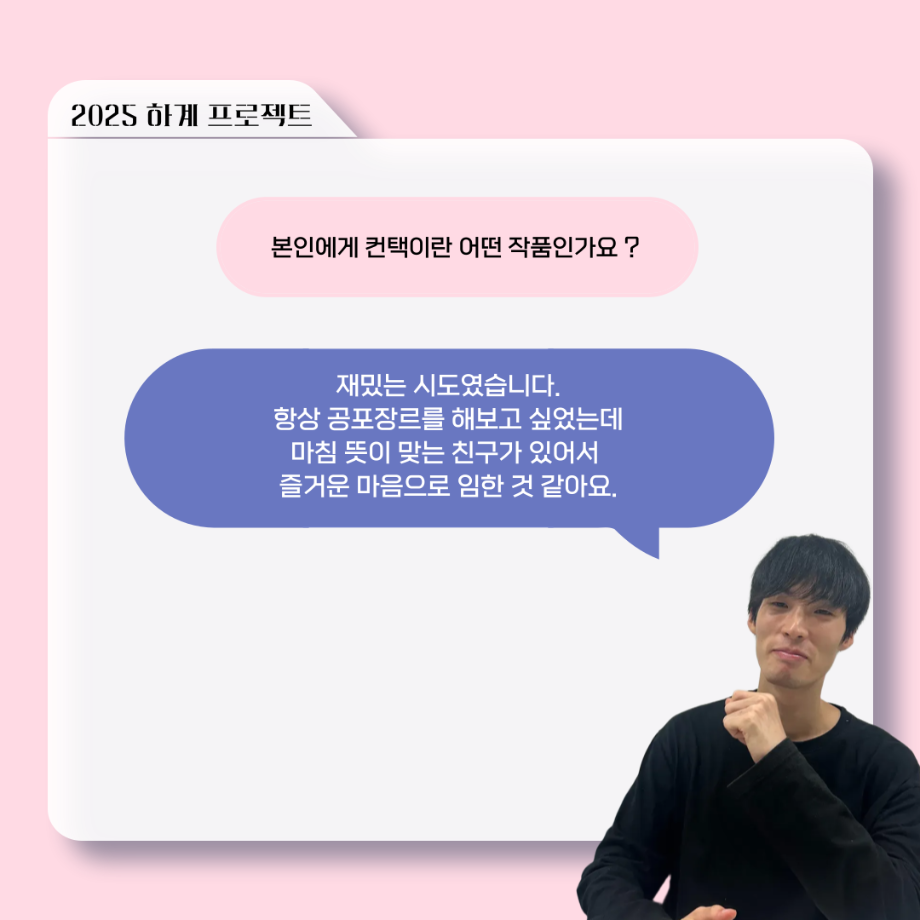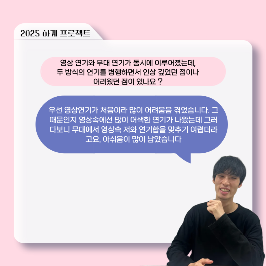본문 시작 홈으로 커뮤니티 학과소개 입학정보 교수소개 학과과정 커뮤니티 공연예매 안내 홈페이지가이드 포토갤러리 공지사항 포토갤러리 작품DB 동아리 학사일정 학생회 포토갤러리 페이스북 트위터 프린트 ‘늘‘ 궁금한 이야기 - 하계 프로젝트 ‘컨택’팀 고진役 < 조진석 > 연기예술학과 2224 2025-10-31 . 목록 이전‘늘‘ 궁금한 이야기 - 현장실습 < 신하연 > 다음 세명대학교 연기예술학과 과체전 담당부서 : 연기예술학과 담당자 : - 연락처 : 043-649-1733 최종수정일 : 2024-10-26 만족도조사 만족도 조사 이 페이지에서 제공하는 정보에 대하여 만족하시나요? 매우만족 만족 보통 불만족 매우불만족