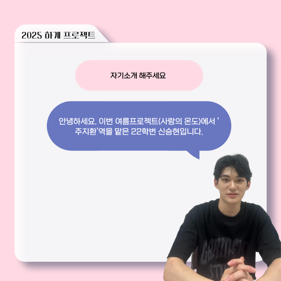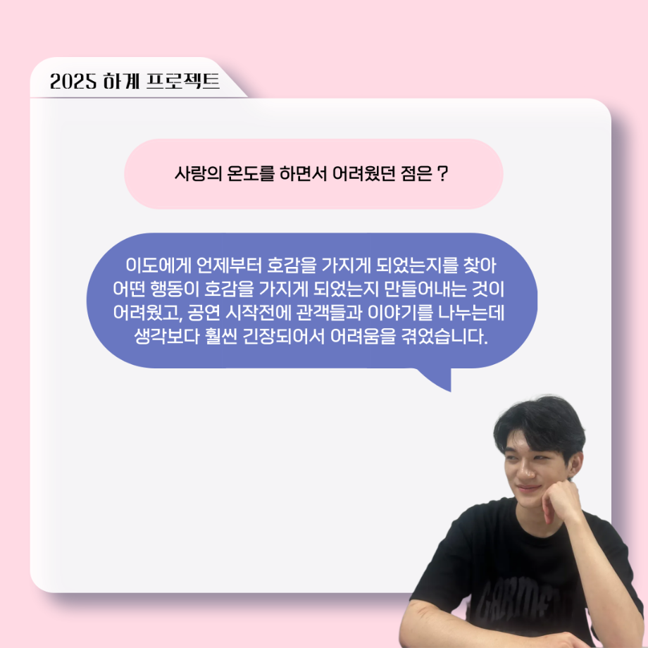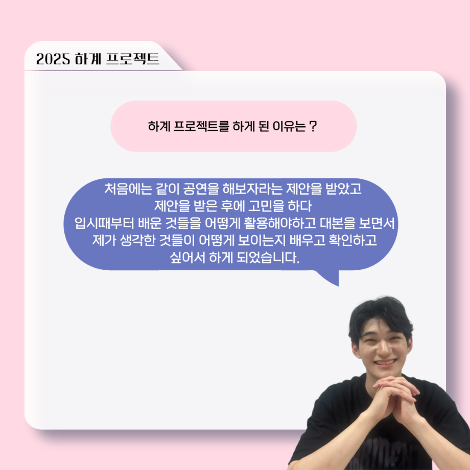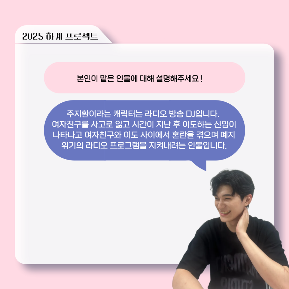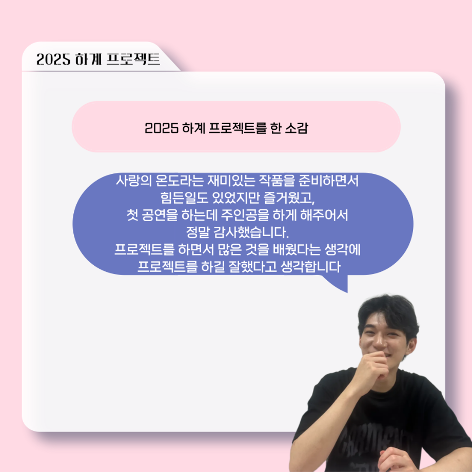 본문 시작 홈으로 커뮤니티 학과소개 입학정보 교수소개 학과과정 커뮤니티 공연예매 안내 홈페이지가이드 포토갤러리 공지사항 포토갤러리 작품DB 동아리 학사일정 학생회 포토갤러리 페이스북 트위터 프린트 ‘늘‘ 궁금한 이야기 - 하계 프로젝트 ‘사랑의 온도’팀 주지환役 < 신승현 > 연기예술학과 1123 2025-11-11 . 목록 이전‘늘‘ 궁금한 이야기 - 하계 프로젝트 ‘사랑의 온도’팀 서이도役 < 함유진 > 다음 ‘늘‘ 궁금한 이야기 - 2025 졸업작품 ‘유랑극장’ 노풍찬役 < 김은혁 > 담당부서 : 연기예술학과 담당자 : - 연락처 : 043-649-1733 최종수정일 : 2024-10-26 만족도조사 만족도 조사 이 페이지에서 제공하는 정보에 대하여 만족하시나요? 매우만족 만족 보통 불만족 매우불만족