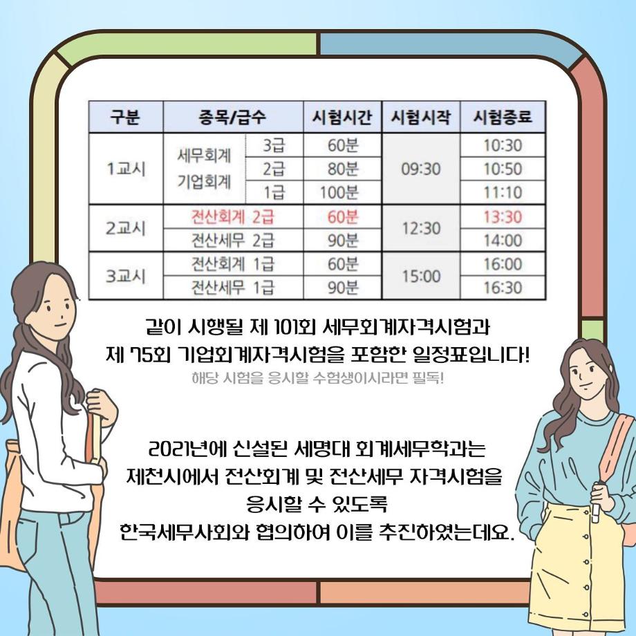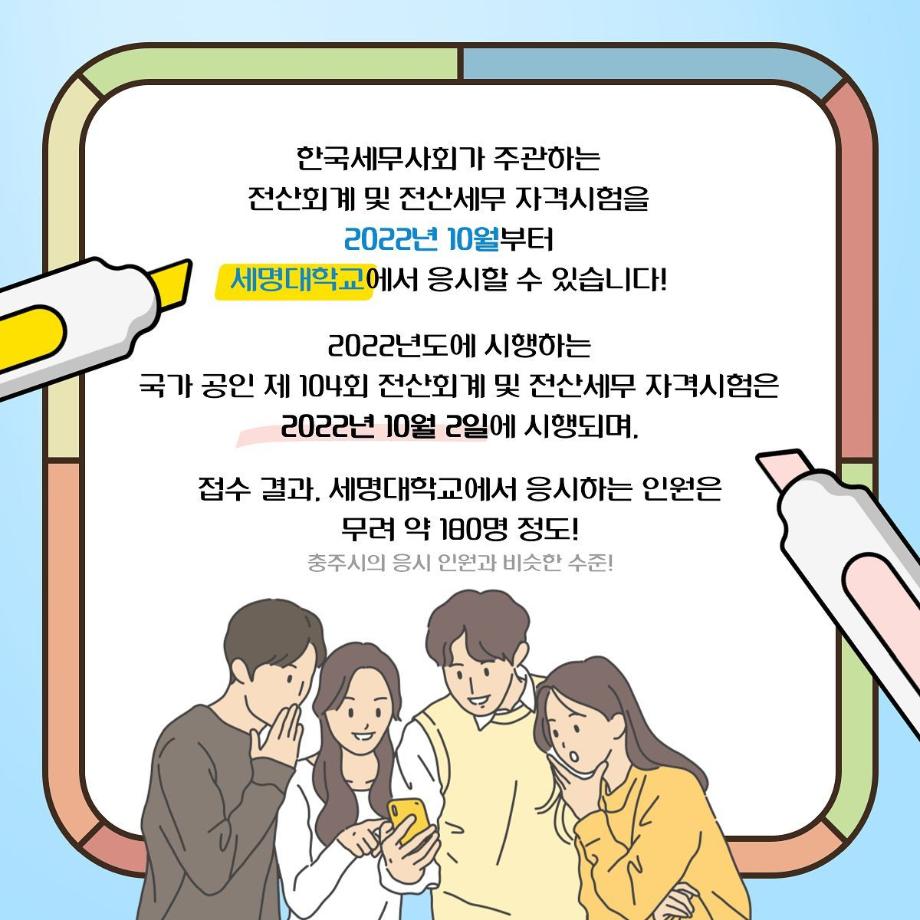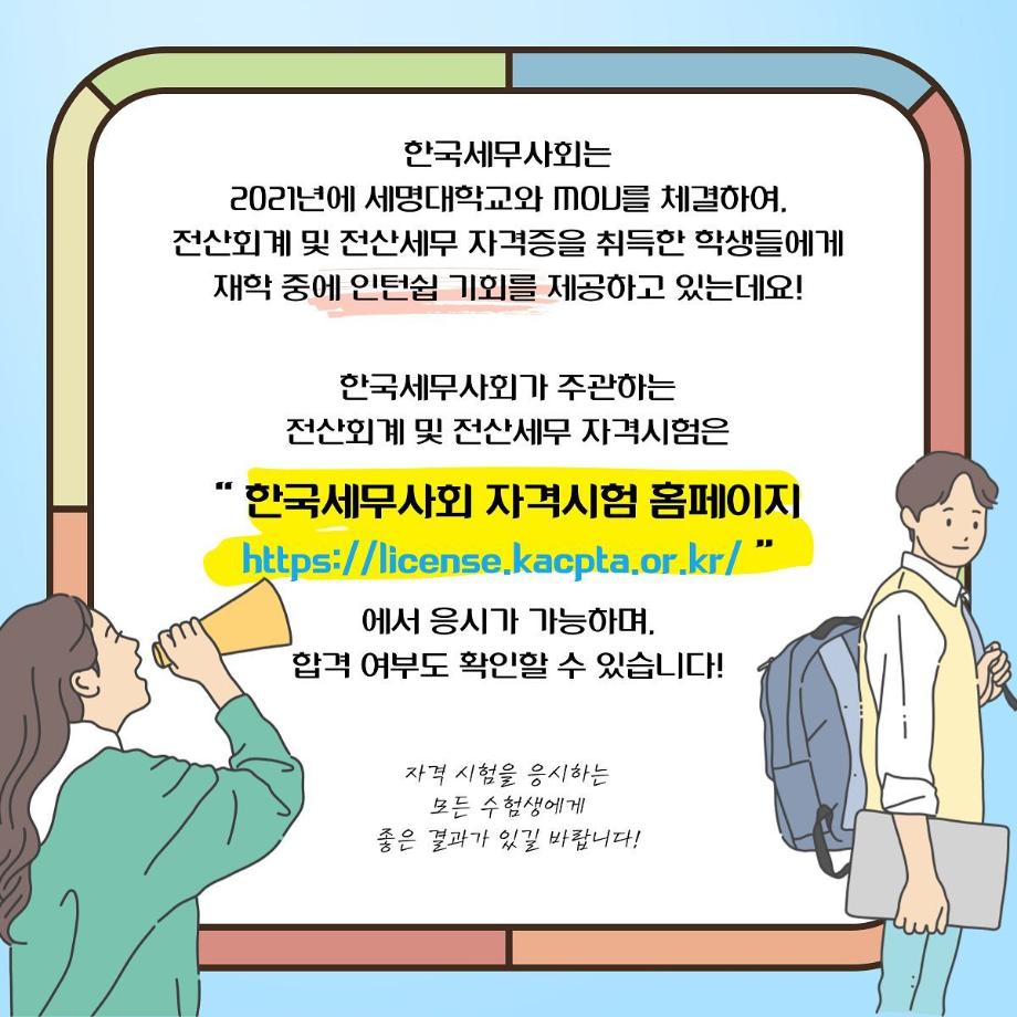 한국세무사회가 주관하는 전산회계 및 전산세무 자격시험을 2022년 10월부터 세명대학교에서 응시할 수 있습니다!