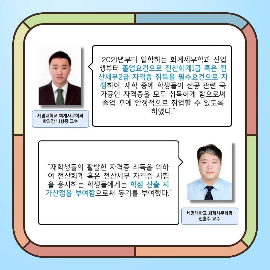 특히나 세명대에 입학하는 회계세무학과 21학번부터는 졸업 요건으로 전산회계1급 또는 전산세무2급 자격증 취득을 '필수요건'으로 지정하였으며,